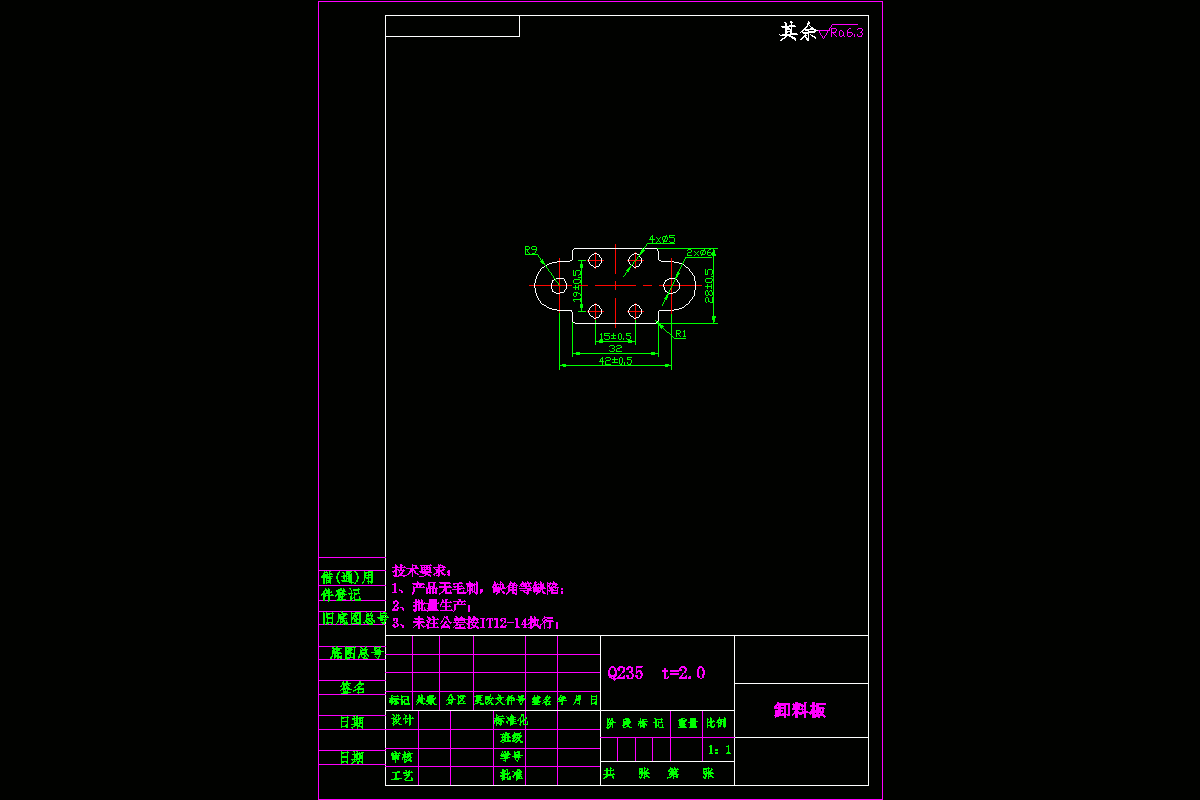 六孔托板-卸料板冲压工艺及模具设计连续级进模含proe三维及15张CAD图。本次重点设计的是一副冲孔落料连续模。这次设计是在老师认真、耐心的指导下进行的,是在对模具的经济性、模具的寿命、生产周期及生产成本等因素进行了全面的仔细的分析下而进行设计的。