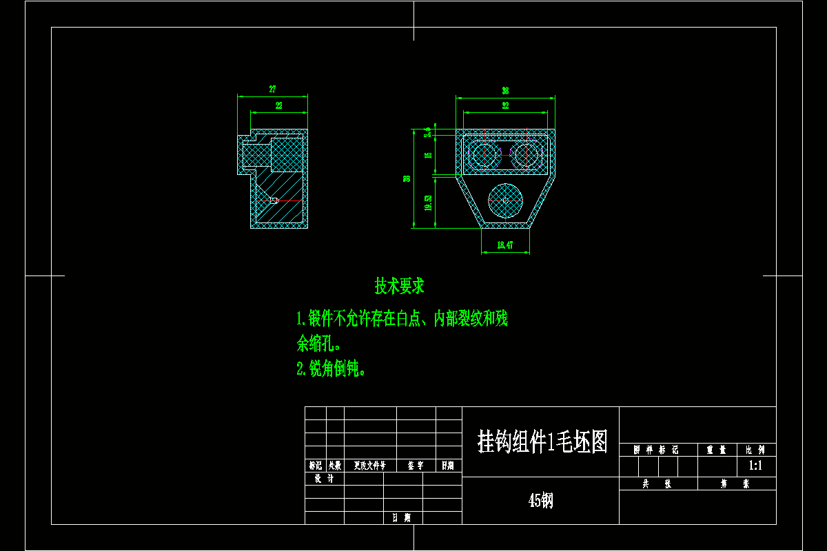 挂钩组件1工艺规程及其钻2-Φ8.5锪沉孔Φ13的工装夹具设计是包括零件加工的工艺设计、工序设计以及专用夹具的设计三部分。在工艺设计中要首先对零件进行分析,了解零件的工艺再设计出毛坯的结构,并选择好零件的加工基准,设计出零件的工艺路线;接着对零件各个工步的工序进行尺寸计算,关键是决定出各个工序的工艺装备及切削用量;然后进行专用夹具的设计,选择设计出夹具的各个组成部件,如定位元件、夹紧元件、引导元件、夹具体与机床的连接部件以及其它部件;计算出夹具定位时产生的定位误差,分析夹具结构的合理性与不足之处,并在以后设计中注意改进。