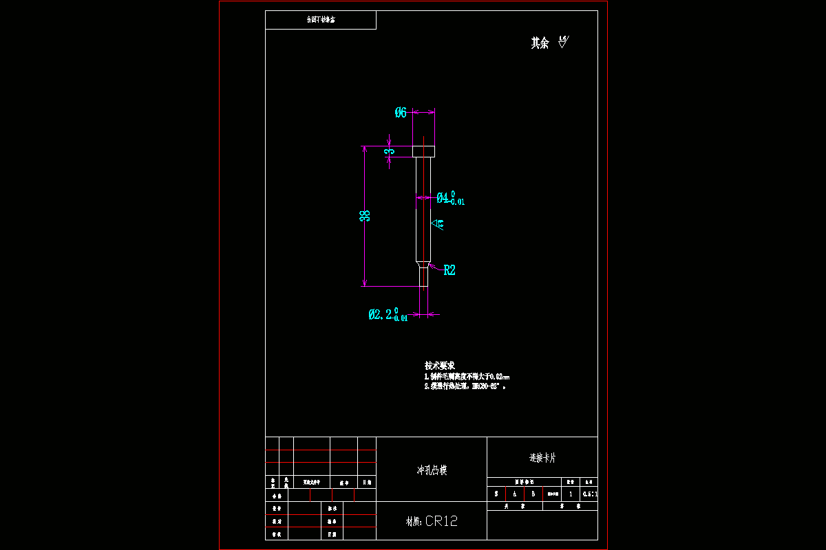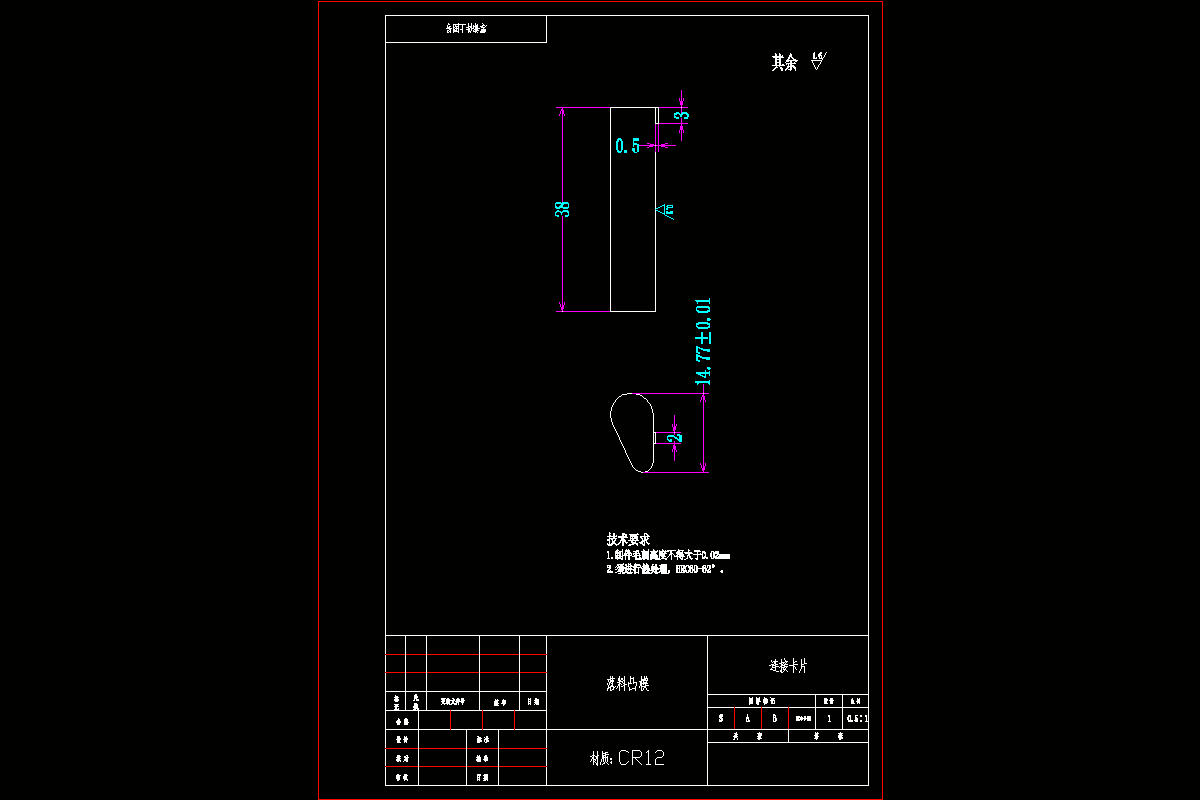 本次课题为连接卡件冲压工艺及模具设计,通过对深入学习,对此零部件模具设计时的设计方式有了雏形。,先分析零件的冲压工艺;确定模具的总体结构;结合零件的冲压工艺及模具的总体结构设计排样图;根据排样图,计算利用率、冲载力、压力、选用设备及刃口的尺寸。根据资料再用AutoCAD,对模具进行设计,然后绘出装配图和零件图进行标注,并编制零件的加工工艺卡,使理论和生产实际知识综合运用,从而培养和提高了我独立工作的能力。