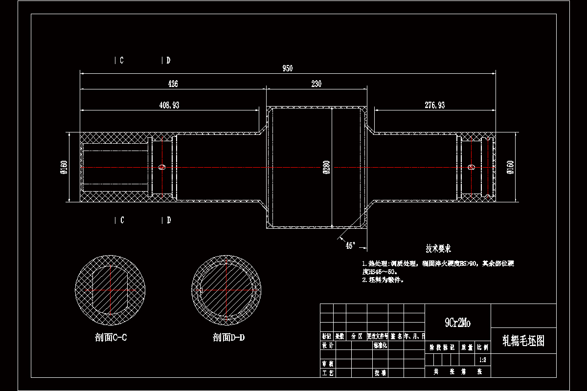 轧辊主要加工表面为:左侧Ф150f7外圆中心线为基准A 2