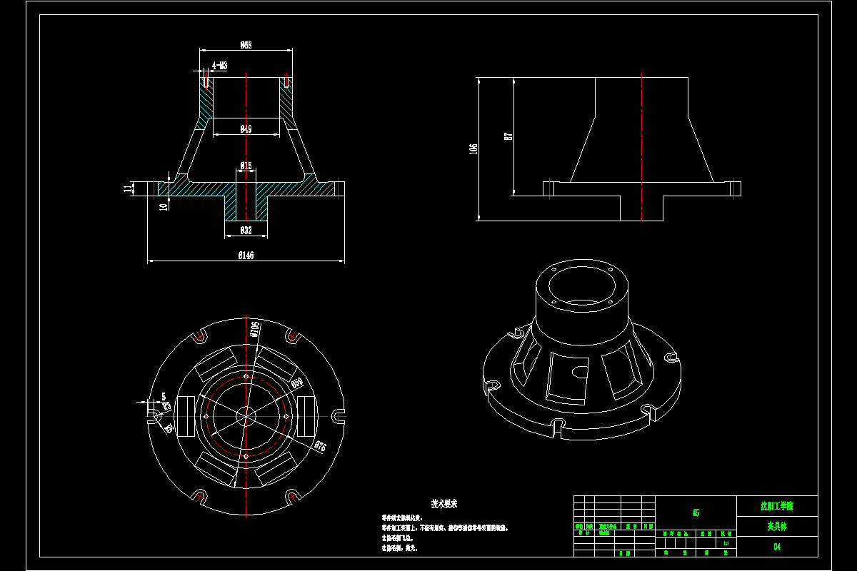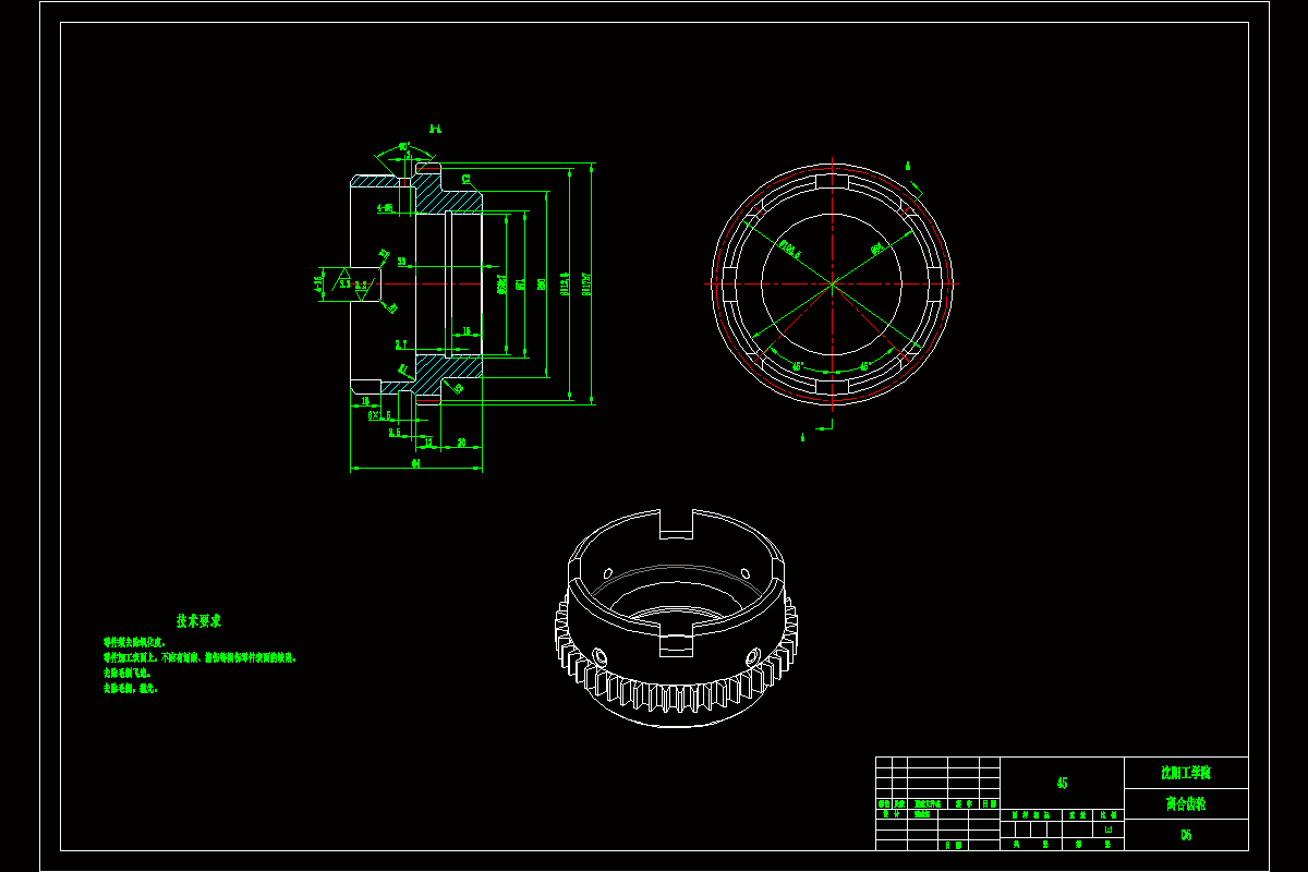 离合齿轮的加工工艺规程及其滚齿的夹具设计是包括零件加工的工艺设计、工序设计以及专用夹具的设计三部分。在工艺设计中要首先对零件进行分析,了解零件的工艺再设计出毛坯的结构,并选择好零件的加工基准,设计出零件的工艺路线;接着对零件各个工步的工序进行尺寸计算,关键是决定出各个工序的工艺装备及切削用量;然后进行专用夹具的设计,选择设计出夹具的各个组成部件,如定位元件、夹紧元件、引导元件、夹具体与机床的连接部件以及其它部件;计算出夹具定位时产生的定位误差,分析夹具结构的合理性与不足之处,并在以后设计中注意改进。