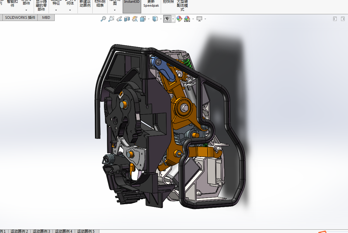 将整个汽车门锁看成是由多个构件组成的运动链系统,画出其工作示意图,介绍了汽车门锁的整体结构、组成部分及其工作原理;应用 solidworks软件,对汽车门锁系统进行了 3D 建模、装配、运动仿真及有限元分析。通过软件设计并分析成功后进行总结。