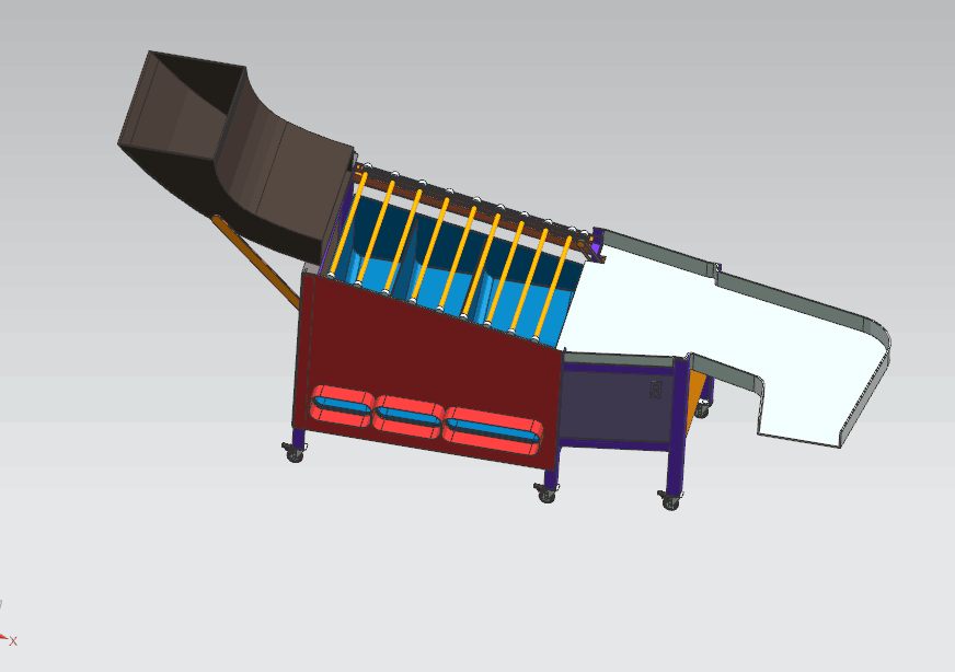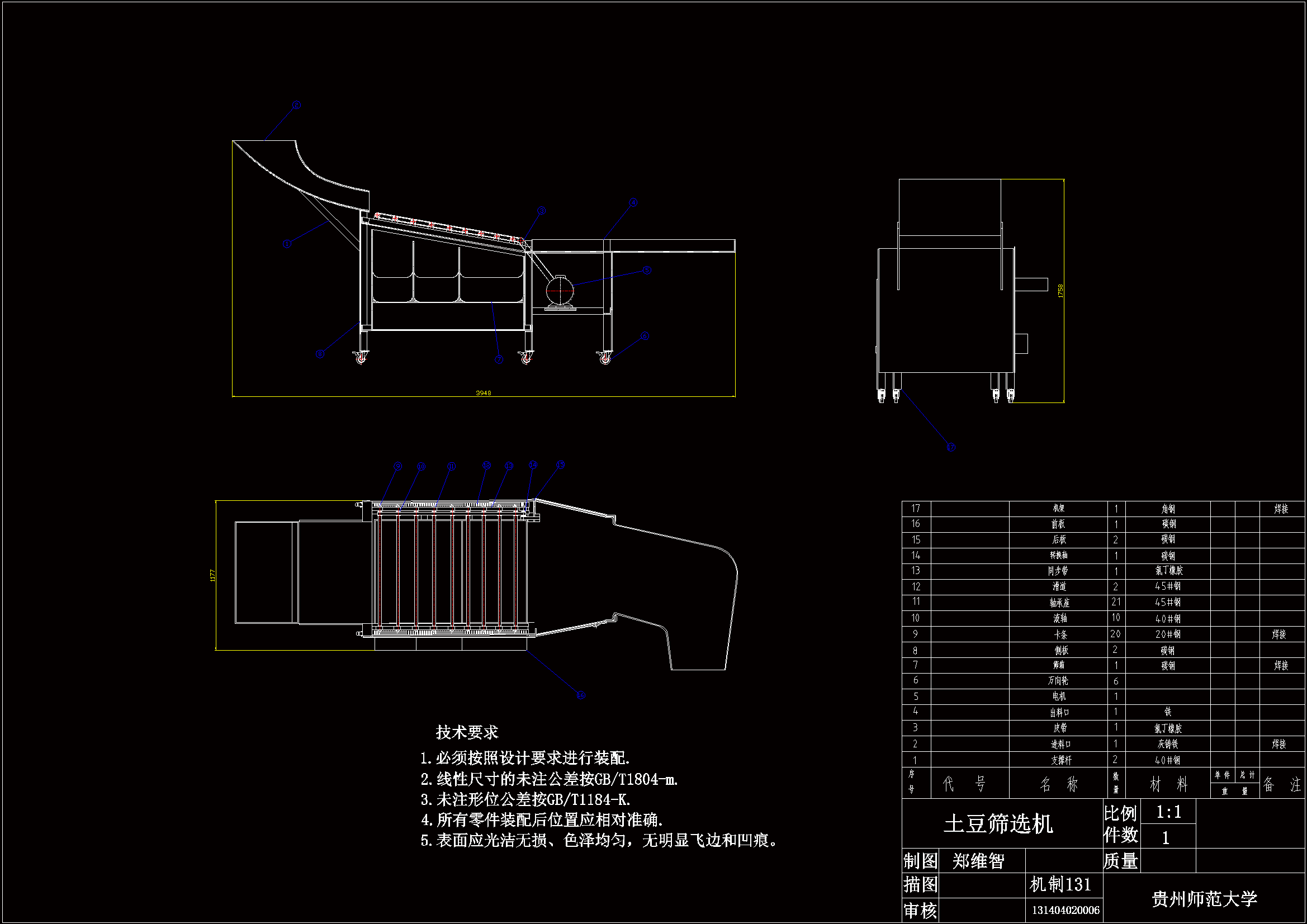 在农作物丰收的季节,针对不同尺寸大小的土豆筛选存在的不足,设计出一种全新的土豆筛选机。这种筛选机可以调节筛面大小,将直径大小不同的土豆进行分类,而且在多农作物混杂的情况,亦可进行分类筛选。土豆筛选机的整体结构主要由进料口、筛面、筛箱、出料口和机架组成,采用同步带和皮带联合的传动设计方案,主要创新设计在于滚轴支座的卡紧定位装置及滑道的设计,可以调节圆柱滚筒的间距,实现筛选不同大小农作物的功能,解决了农民们筛选土豆损耗精力的问题,同时减少了生产成本,提高了生产效率。