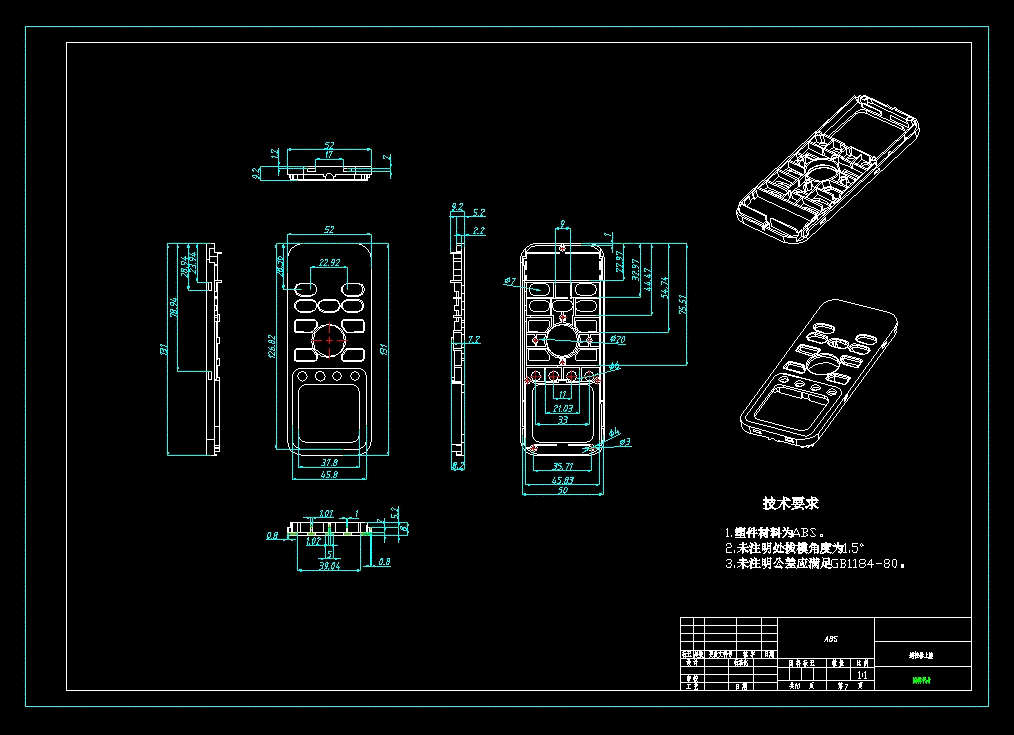 本设计为遥控器面板注塑模具设计,它介绍了注塑成型的基本原理,课题任务书要求是对一种遥控器面板进行合理结构的模具设计,分析塑件的材料和结构后,可以知道这一类的产品都是需要采用注射模具的成型工艺来生产的产品,这次主要是用电脑绘图完成这次课题设计。注塑模具现在使用的比较多,主要是针对产量高的塑件产品使用:特别适合精度要求搞,需求量又大的这一类塑胶产品比较适合,这样来生产又可以保证产量,也可以保证使用功能不受影响。注塑模具的应用用途也很广泛,基本所有的塑料材料都可以生产,模具质量可靠的前提下,产品的质量也会很高,而且可以实现自动化生产。这次设计过程主要分为几部,先分析产品结构性能,然后三维UG软件进行建模,然后分模,画出主要的成型零件,在这之前需要进行一系列的计算,保证自己设计的强度是可以满足要求的、而且需要选择好成型模具的穴数,这个主要按照产品的结构和注塑机的大小决定是否合适,后面设计好装配图,然后还需要设计出来模具的各零件的细节,然后吧那些零件的图纸转换成CAD的二维工程图,做完图纸,需要整理好之前的设计计算。把这些计算都写说明书,按照规定的格式完成设计说明书的排版。