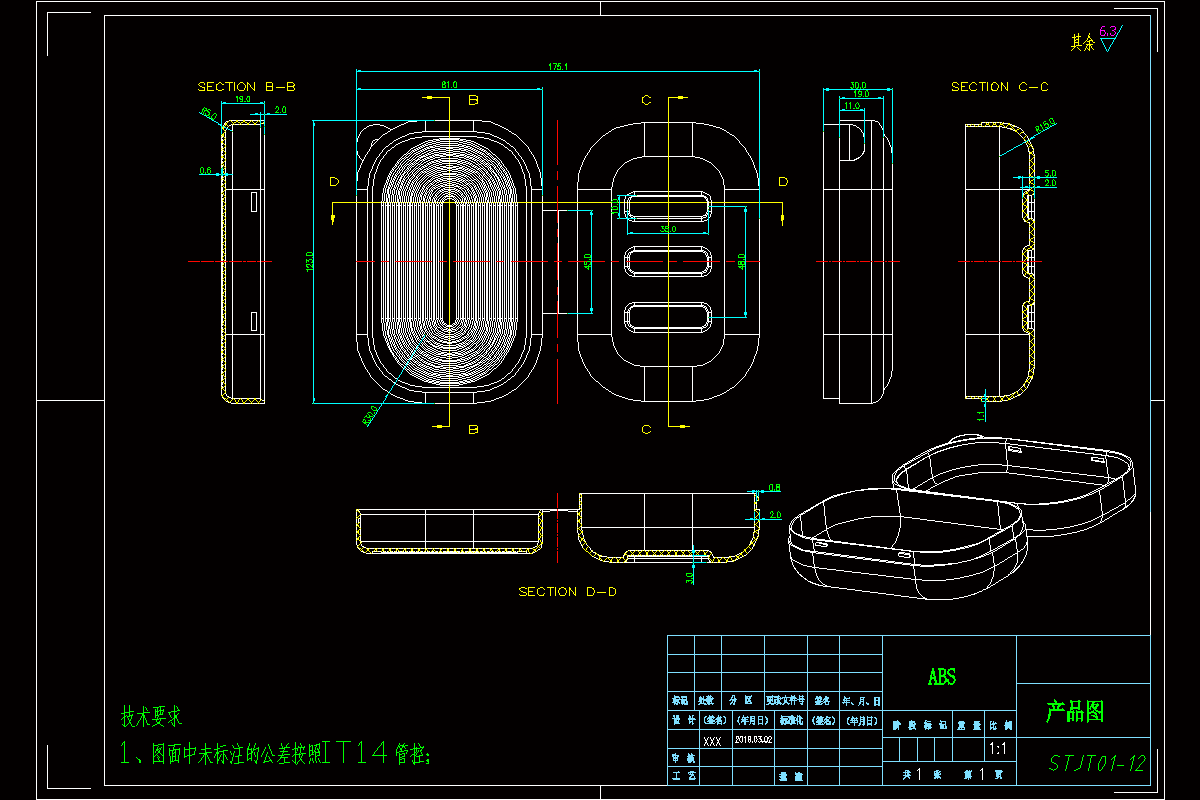 塑料是一种可塑性的合成高分子材料,具有重量轻且坚固,耐化学腐蚀,电绝缘性好,价格便宜,可塑性好等特点,广泛应用于电脑、手机、汽车、电机、电器、家电和通讯产品制造中。注塑成形是成形塑件的主要方法之一,是指使用注塑机将热塑性塑料熔体在高压下注入到模具内经冷却固化获得产品的方法。注塑的优点是生产速度快,效率高,操作可自动化,能成型形状复杂的零件,特别适合大量生产。本次设计的产品为肥皂盒,具有重量轻,强度高,耐腐蚀,易清洁等特点,为大批量生产产品。本次设计在针对产品进行工艺性分析后,确定模具分型面、型腔数目、浇口形式、位置大小;其中最重要的是确定型芯和型腔的结构,以及它们的定位和紧固方式。此外还进行了脱模机构的设计,合模导向机构的设计,冷却系统的设计等。最后绘制完整的模具装配总图和主要的模具零件图及编制成型零部件的制造加工工艺过程卡片。实践证明:该模具结构合理、可靠,并能保证产品质量,对此类注塑产品的模具设计有参考价值。