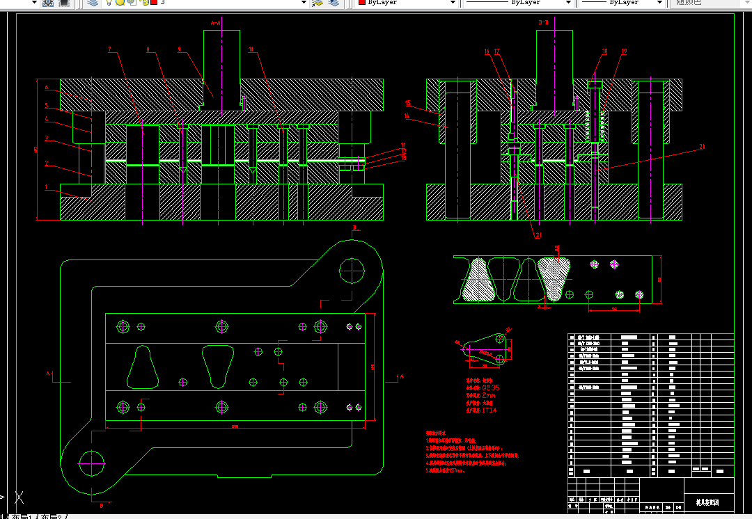 从连接口外形结构分析,该工件轮廓结构由直线圆弧过度相切,工件形状具备对称性。模具的设计先从工件的工艺结构出发,根据工件图只要求和形状来确定模具的设计方案,模具采取了级进模具结构,从而进步一确定模具制造精度等级,和排样设计从而确定出模具的类型结构,从实际生产的角度出发,为了节约模具制造成本,提高产品生产效率,保证工件的生产精度,该工件的冲裁模具设计方案采用了复合模具冲裁。在模具设计前主要查找工件图纸中未标注公差的尺寸公差,根据尺寸公差来确定模具制造的精度,经过多次的排样分析以后,开始进行模具的结构设计,计算模具的闭合高度、卸料力、冲裁力、冲裁间隙、模具装配配合间隙、凸模高度、压力中心、模具总压力,根据总冲压力选择冲压设备;所有的设计方案确定以后开始绘制模具草图、装配图、零件图、编写技术要求、设计说明书。