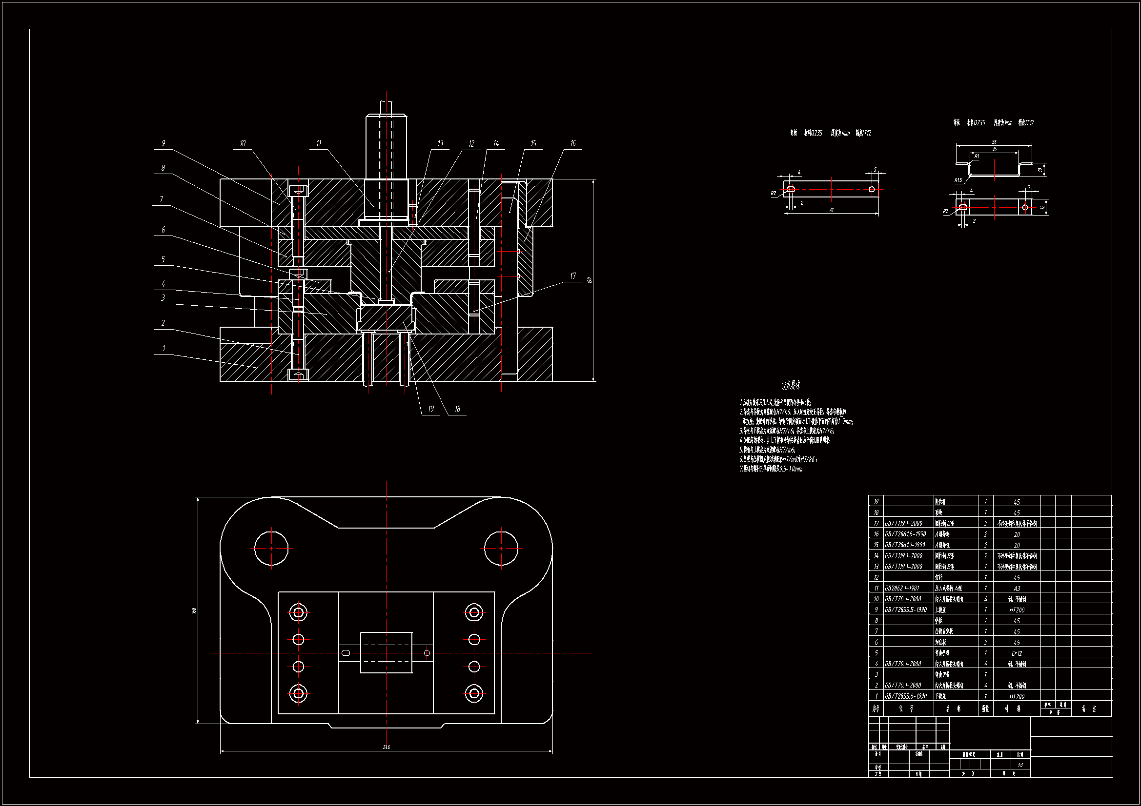 弯板是一种常用的五金件,由于其本身的特殊性,导致了弯板冲裁时精度难以保证,设计中,我们采用特殊的结构来完成弯板五金件的冲裁。弯板采用Q235钢制作而成,厚度为1mm,弯板零件上有一个圆孔和一个长圆孔,圆孔的最小直径为4mm,还有U形弯曲工序。所以弯板可以采用较简单的复合冲裁模和弯曲模。复合冲裁模采用多工序同时加工,复合冲裁模加工的精度较高且弯板要求无翘曲无扭曲。所以选择复合模。本论文从凹模开始设计,选择模架,设计凸模,再算其他模具零件尺寸。