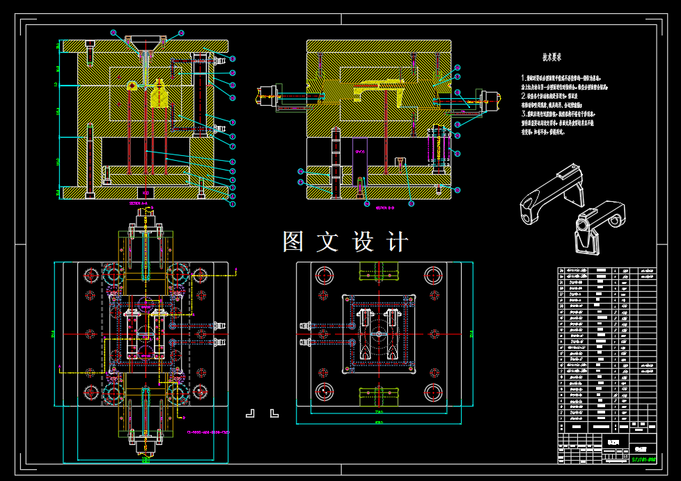 本文主要介绍的是台灯支架注塑模具的设计方法。首先分析了台灯支架制件的工艺特点,包括材料性能、成型特性与条件、结构工艺性等,并选择了成型设备。接着介绍了台灯支架注塑模的分型面的选择、型腔数目的确定及布置,重点介绍了浇注系统、成型零件、合模导向机构、脱模机构、定距分型机构以及冷却系统的设计。然后选择标准模架和模具材料,并对注射机的工艺参数进行相关校核。