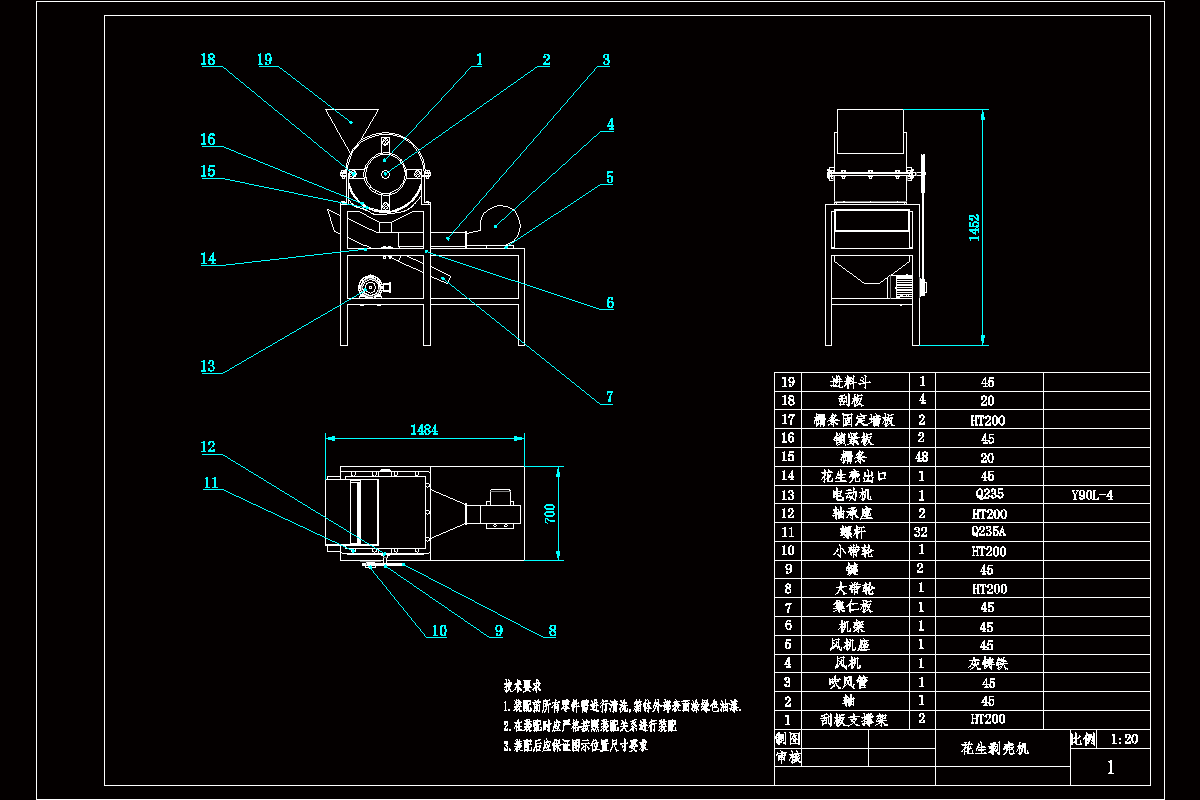 花生脱壳机是将花生荚果去掉外壳得到花生仁的场上作业机械。由于花生本身的生理特点决定了花生脱壳不能与花生田间收获一起进行联合作业,而只能在花生果的含水率降低到一定程度后才能进行脱壳。花生脱壳机在减轻人们的劳动强度、提高生产率方面起到了积极作用,促进了花生工业的发展。随着花生种植业的不断发展,花生手工脱壳已经无法满足高效生产要求,实行脱壳机械花迫在眉睫。但是,目前国内外花生脱壳机对花生破碎率和损伤率的指标要求都比较高,超出种用籽和商品化的标准,限制了使用范围。因此,降低花生脱壳机的破碎率和损伤率仍是研制花生脱壳机的关键问题。针对花生果的物理特性本设计了一种刮板式花生脱壳装置,该脱壳装置功能单一,结构简单,价格便宜,满足小型规模的生产需求,实现了花生剥壳的机械化,应用本机器后,可使广大农民群众大大节省劳动量,提高生产效率和生产质量,为花生联合生产设备的研究设计提供理论依据。