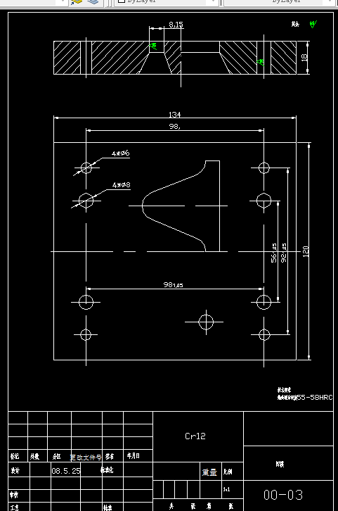 本模具的凸模以装在弹压导板中的导板镶块导向,弹压导板一导柱导向,导向准确,保证凸凹模的精确配合,并且加强了凸模纵向稳定性,避免小凸模产生纵向弯曲。凸模与固定板为间隙配合,凸模装配调整和更换很方便。弹压导板用卸料螺钉与上模连接,加上凸模与固定板知道是间隙配合,因此能消除压力机导向误差对模具的影响,对延长模具寿命有利。冲裁排样采用直对排,一次冲裁获得两个零件,两件的落料工位离开一定距离,以增强凹模的强度,也便于加工和装配。