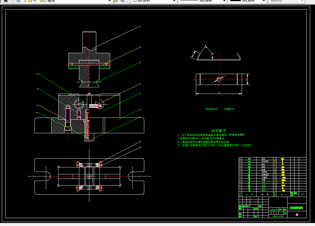 模具设计的方法及步骤基本上是根据它的内容来决定的,它们之间是相互穿插影响的。通过对弯曲件结构以及冲压工艺进行分析,初步确定工艺方案,然后对其主要参数进行计算,确定毛坯的尺寸,凸凹模的大小以及压力机吨位等。对模具进行整体设计后对模具各零件进行装配。接着在压力机上安装并试冲,获得合格制件标志着模具设计成功。