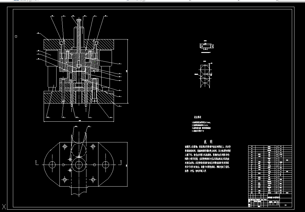 本设计采用正装复合模,通过落料、拉伸、冲孔、切边工序在一次行程中完成制件的成形。模具采用后侧导柱导向方式,导料采用导料板,送进步距控制采用挡料销,采用固定卸料、刚性打杆、打板卸料方式。如果不考虑经济成本时,采用级进模设计会更好。
