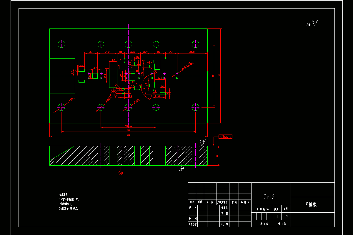 本设计进行了冲压模具的设计。文中简要概述了冲压模具目前的发展状况和趋势。对产品进行了详细工艺分析和工艺方案的确定。进行了凹、凸模的闭合高度的计算并确定了模具的结构。计算并设计了本套模具上的主要零部件,如:凸模、凹模、凸模固定板、垫板、凹模固定板、卸料板、导板、挡料销等。选定了合理的冲压设备。设计中对工作零件和压力机规格均进行了必要的校核计算。此外,本模具采用挡料销挡料。模具的冲压凸模用固定板固定,便于调整间隙;冲压凹模则采用整体固定板固定。