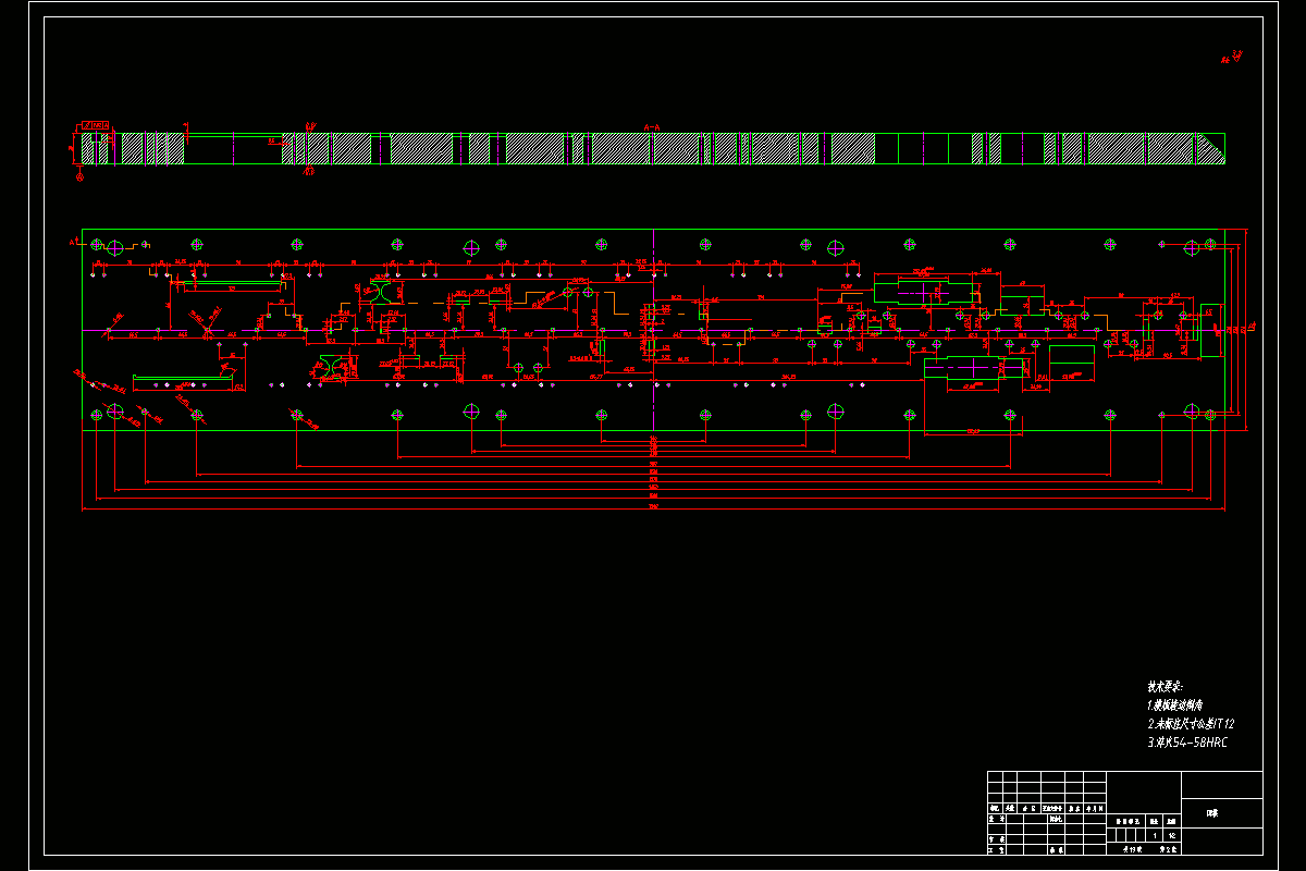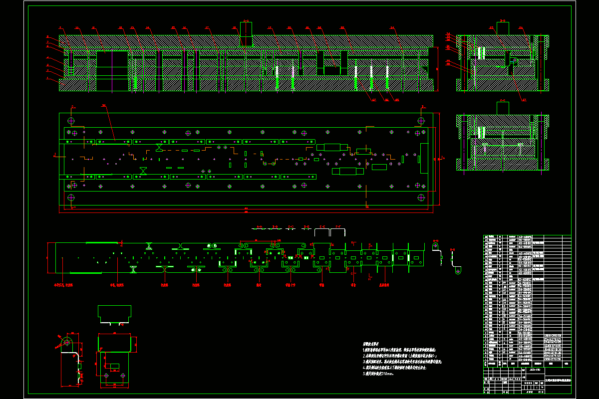 分析了设计课题尺寸、形状、结构成形工艺,工件由冲孔、落料、弯曲等工艺构成,冲裁件结构难度中等,比较适合作为设计的课题,根据工件图纸上的技术要求,冲裁件尺寸精度、表面质量、生产批量、冲裁件材料力学性能等,综合分析,决定采用级进模具冲裁。设计方案结束后开始做棑样设计,计算材料利用率,冲裁力,弯曲力,冲裁间隙压力中心的,选取冲压设备,绘制装配草图、装配图、主要工作零件的技术图纸,最后编写设计说明书准备答辩。