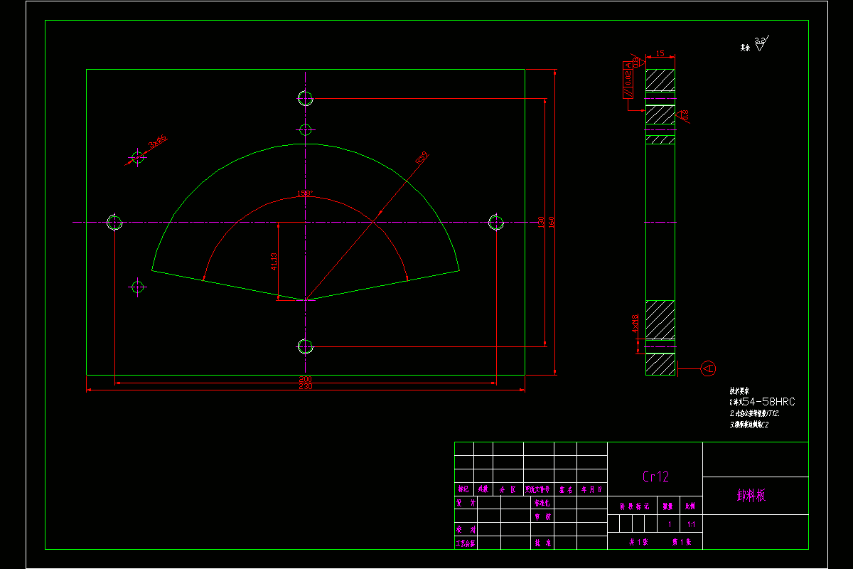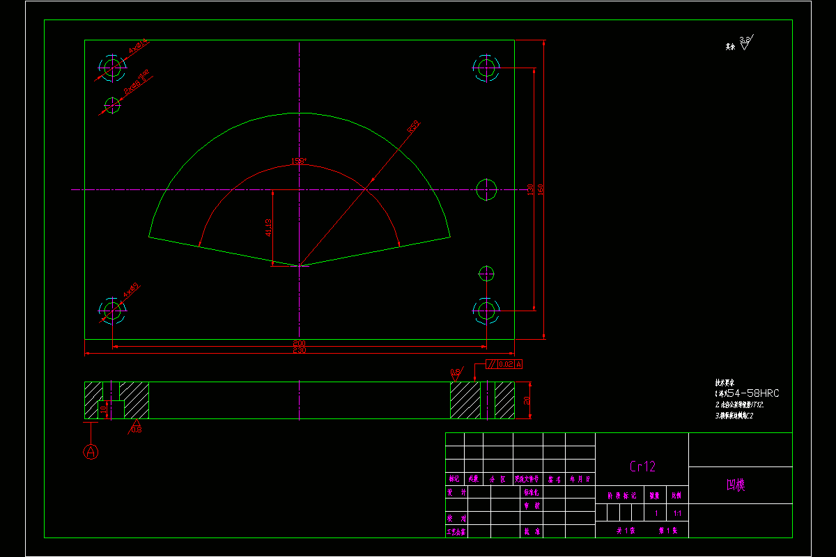 从工件结构分析,该工件轮廓结构由直线圆弧构成,工件形状具备对称性。模具的设计的设计先从工件的工艺结构出发,根据工件图只要求和形状来确定模具的设计方案,进步一确定模具制造精度等级,和排样设计从而确定出模具的类型结构,从实际生产的角度出发,为了节约模具制造成本,提高产品生产效率,保证工件的生产精度,该工件的冲裁模具设计方案采用了复合模具冲裁。在模具设计前主要查找工件图纸中未标注公差的尺寸公差,根据尺寸公差来确定模具制造的精度,经过多次的排样分析以后,开始进行模具的结构设计,计算模具的闭合高度、卸料力、冲裁力、、冲裁间隙、模具装配配合间隙、凸模高度、压力中心、模具总压力,根据总冲压力选择冲压设备;所有的设计方案确定以后开始绘制模具草图、装配图、零件图、编写技术要求、设计说明书。