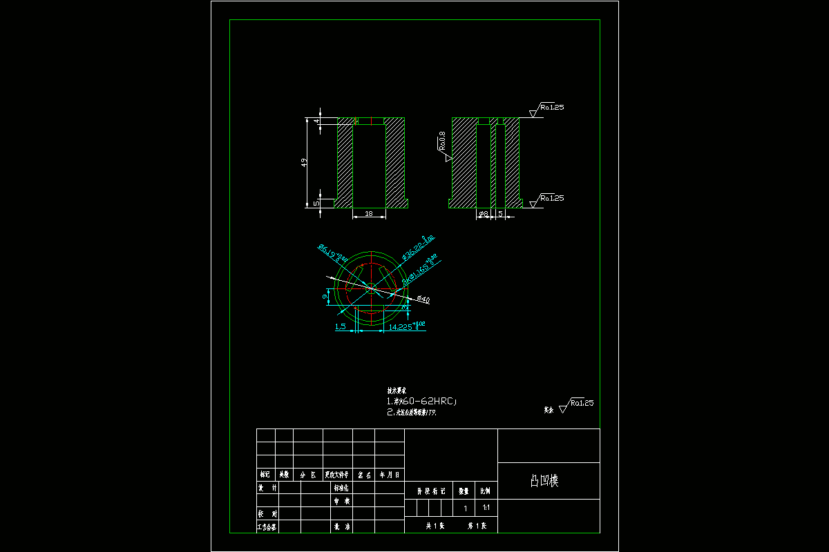 从垫片结构分析,该工件轮廓结构由直线圆弧相切,工件形状具备对称性。模具的设计的设计先从工件的工艺结构出发,根据工件图只要求和形状来确定模具的设计方案,进步一确定模具制造精度等级,和排样设计从而确定出模具的类型结构,从实际生产的角度出发,为了节约模具制造成本,提高产品生产效率,保证工件的生产精度,该工件的冲裁模具设计方案采用了复合模具冲裁。在模具设计前主要查找工件图纸中未标注公差的尺寸公差,根据尺寸公差来确定模具制造的精度,经过列举多个排样,分析凸凹模强度结构,计算材料利用率对比,选择既要节约材料,模具性能稳定,选择最优方案进行模具的设计。模具设计时要重点分析材料,根据材料力学性能和各种极限强度值计算实现冲压工艺所需要的力,并且选择相对应的压力机型号个规格,从压力计的技术参数,设计模具的结构,保证模具能与所选的压力机相对应,且能投入生产使用。模具结构设计完成以后,开始绘制主要非标准件的零件,撰写模具的先关设计数据,斌按照规定要的格式排版。