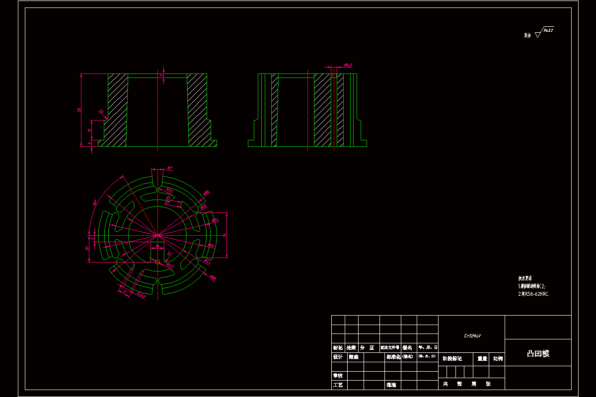 发动机转子复合模具设计。从课题所给定的零件图,结合其外形结构和尺寸、公差,首先对其工件工艺进行分析;其次,进行模具的棑样设计,合理的选择排样搭边值;再次,计算模具的总冲压力,找出模具的压力中心,选择符合的冲压设备型号的;最后选择模具使用的标准件,绘制模具总装图及所有非标准件以外的零件图,编写设计说明书。结合工件的尺寸、精度、生产批量,从实际生产的角度出发,为了节约模具制造成本、提高产品生产效率,保证工件的生产精度,选择复合模具的冲裁方案。