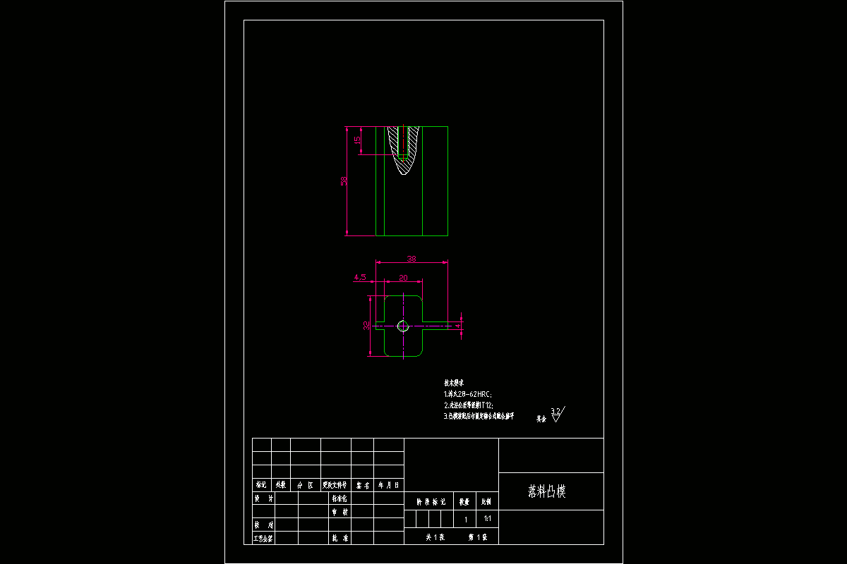 从刷片结构分析,该工件轮廓结构由直线圆弧相切,工件形状具备对称性。模具的设计的设计先从工件的工艺结构出发,根据工件图只要求和形状来确定模具的设计方案,进步一确定模具制造精度等级,和排样设计从而确定出模具的类型结构,从实际生产的角度出发,为了节约模具制造成本,提高产品生产效率,保证工件的生产精度,该工件的冲裁模具设计方案采用了复合模具冲裁。在模具设计前主要查找工件图纸中未标注公差的尺寸公差,根据尺寸公差来确定模具制造的精度,经过多次的排样分析以后,开始进行模具的结构设计,计算模具的闭合高度、卸料力、冲裁力、、冲裁间隙、模具装配配合间隙、凸模高度、压力中心、模具总压力,根据总冲压力选择冲压设备;所有的设计方案确定以后开始绘制模具草图、装配图、零件图、编写技术要求、设计说明书。
