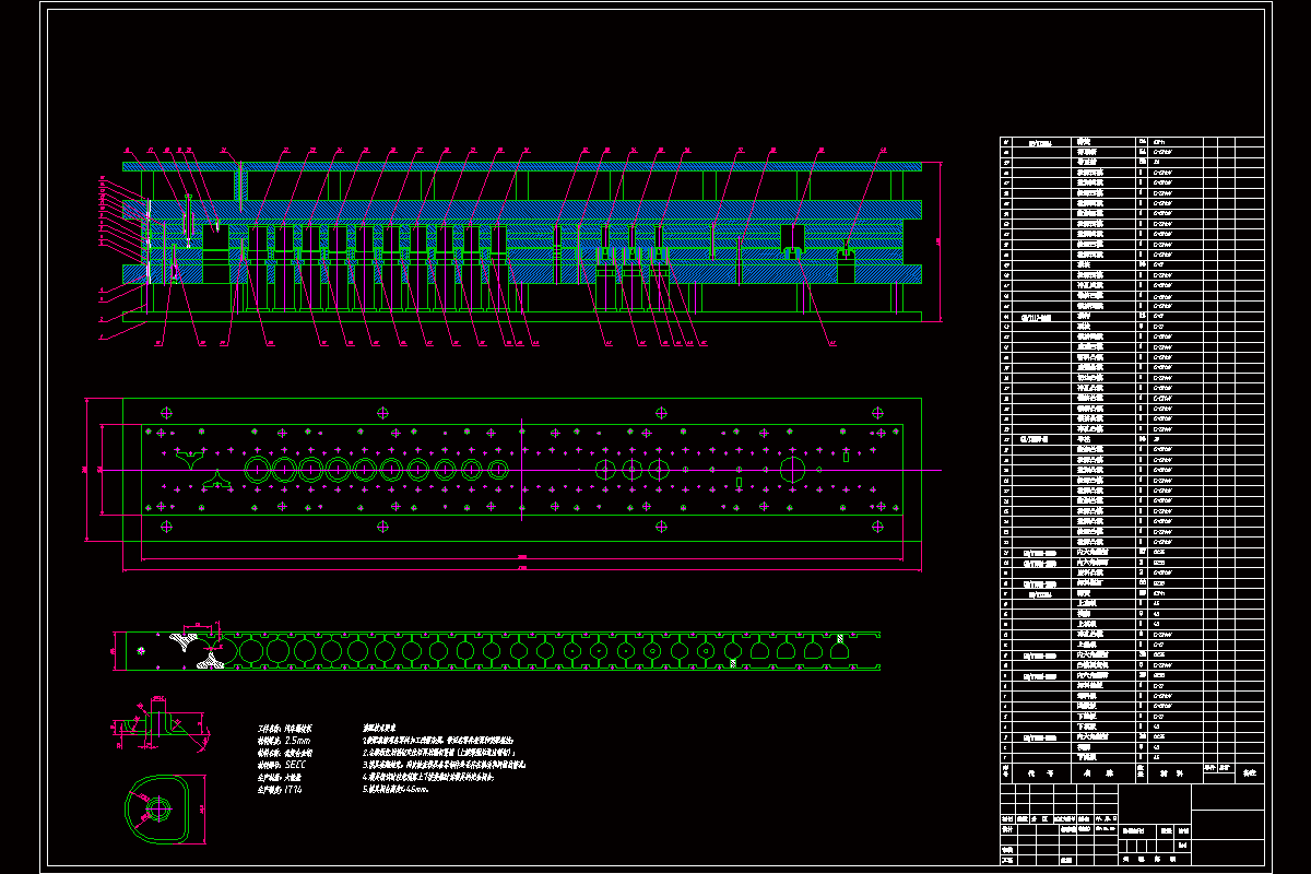 本次设计的零件汽车螺纹板级进模具设计,零件为经典的拉深翻、挤墩工序结构,模具的排样从拉深开始设计,其次到冲孔、再次挤墩、最后成型落料,模具共分为26个工位模凹模周界尺寸为2080×250mm,模具设计需要计算冲裁力、压力中心、拉深成型次数、拉深力,零件的坯料尺寸,模具的弹顶装置,保证模具运行时,排样条料能够顺利前送。