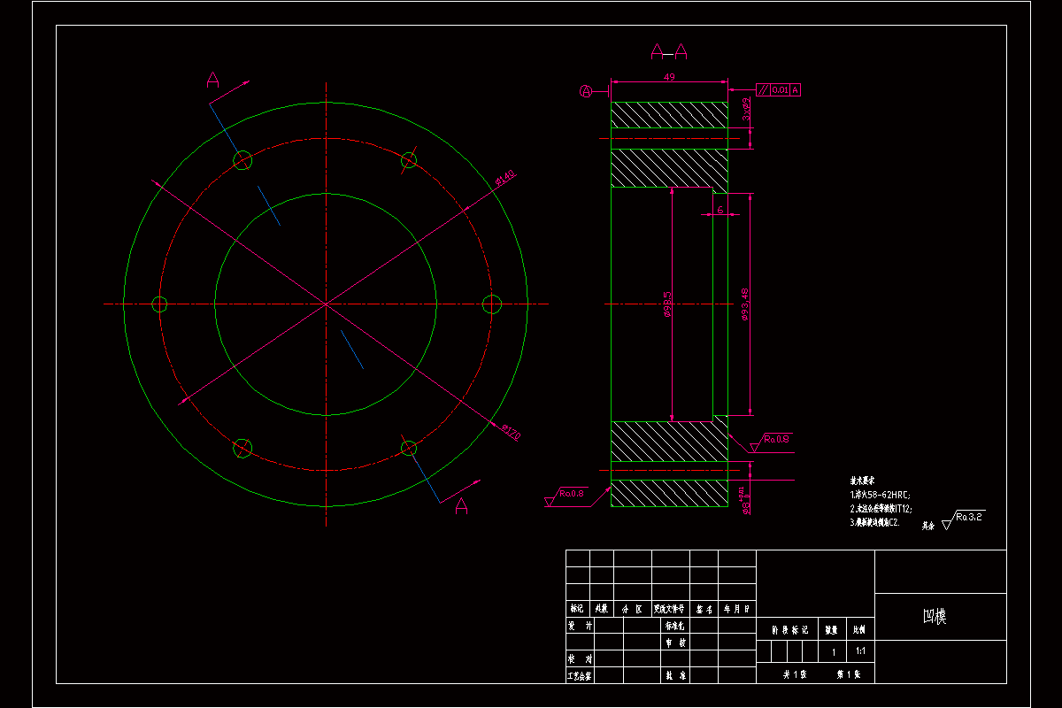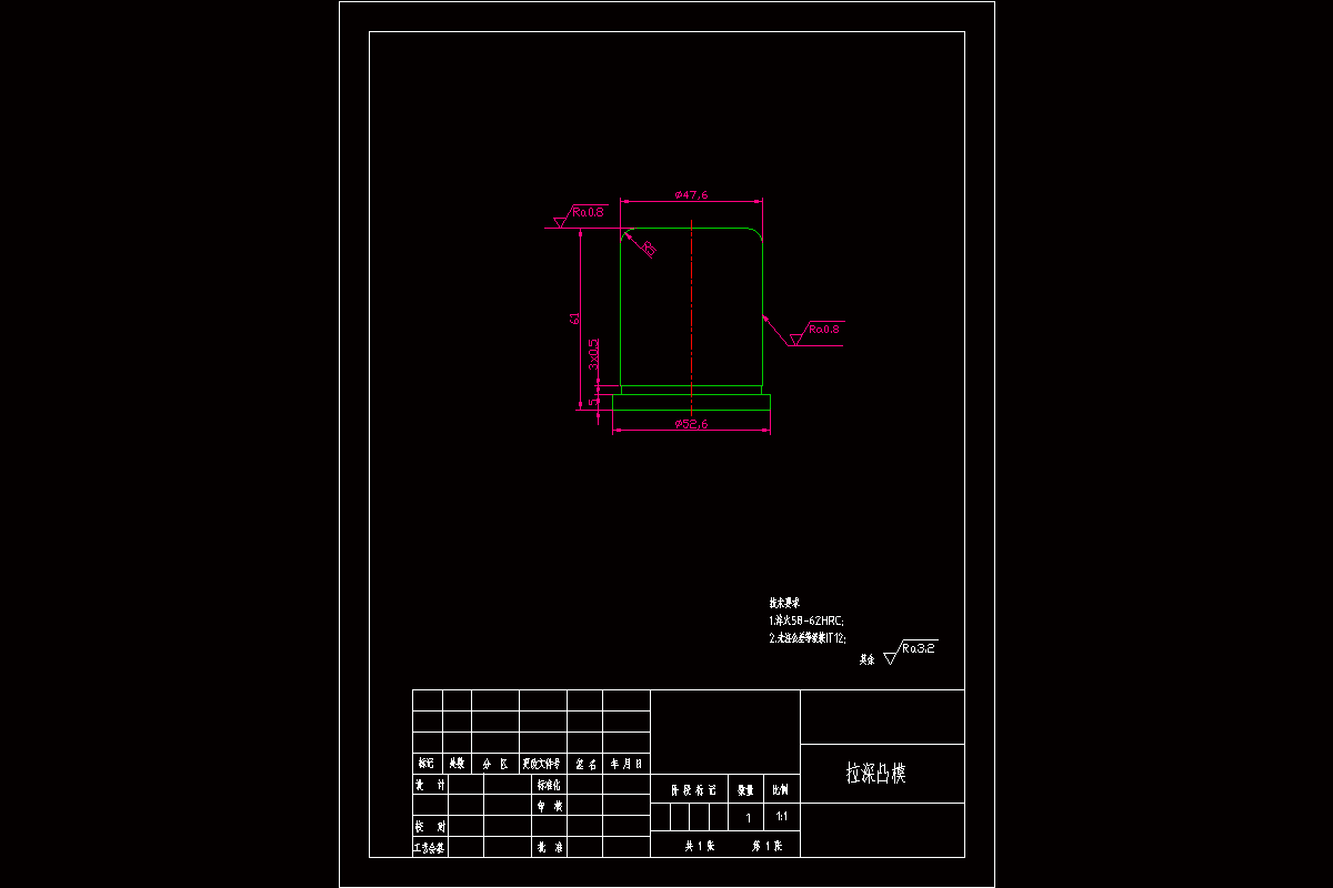 分析下盖工件的结构和工艺,该工件属于圆筒无凸缘拉深件,工件形状具备对称性。模具的设计的设计先从工件的工艺结构出发,计算拉深次数,根据工件图只要求和形状来确定模具的设计方案,进步一确定模具制造精度等级,和排样设计从而确定出模具的类型结构,从实际生产的角度出发,为了节约模具制造成本,提高产品生产效率,保证工件的生产精度,该工件的冲裁模具设计方案采用了落料拉深复合模具冲裁。在模具设计前主要查找工件图纸中未标注公差的尺寸公差,根据尺寸公差来确定模具制造的精度,经过多次的排样分析以后,开始进行模具的结构设计,计算模具的闭合高度、卸料力、冲裁力、冲裁间隙、模具装配配合间隙、凸模高度、压力中心、模具总冲压力,根据总冲压力选择冲压设备;所有的设计方案确定以后开始绘制模具草图、装配图、零件图、编写技术要求、设计说明书。