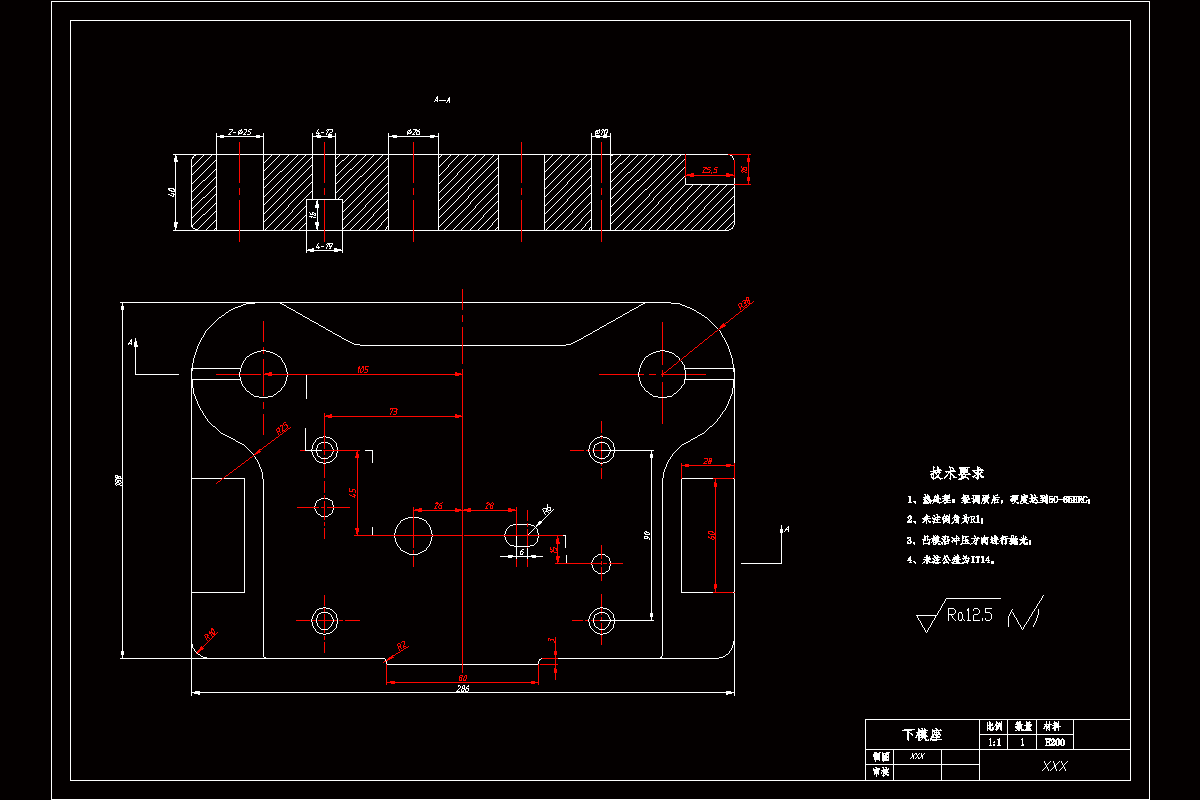 从工件的外形来分析,工件由冲裁工艺构成,工件内外轮廓均由直线圆弧相切构成,在工件上需要冲两个孔,工件具备轴对称性,属于经典的落料复合模具设计的题材。因此模具的设计和排样从冲孔、落料、等工艺分析出发,需要考虑各孔位冲裁时对外轮廓影响情况,查阅相关设计手册,工件是否符合冲裁加工。从实际生产的角度出发,为了节约模具设计、用材、制造成本,提高工件生产效率和尺寸精度,综合分析该工件的模具设计方案采用了复合模具冲裁。在模具设计前主要分析个尺寸轮廓工艺的受力情况,查找未标注公差的尺寸公差,根据尺寸公差来确定模具制造的精度,确定排样方案和条料的宽度,选取模架结构,计算模具的冲裁间隙、压力中心、模具闭合高度和冲压力的综合,再一步的选取相对应的冲压设备,使用CAD制图软件绘制模具装配图、主要工作零件图,撰写模具相关设计说明书。