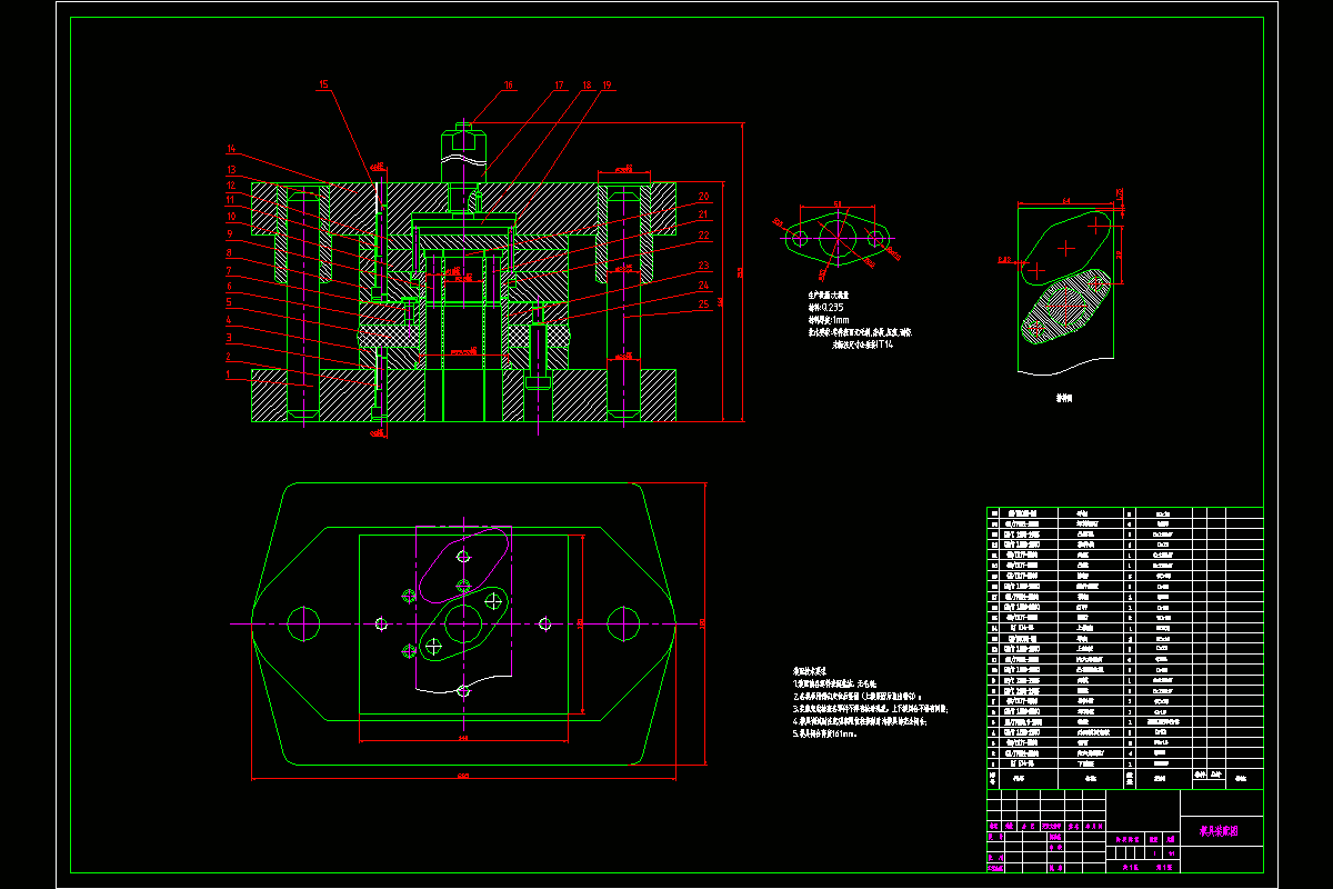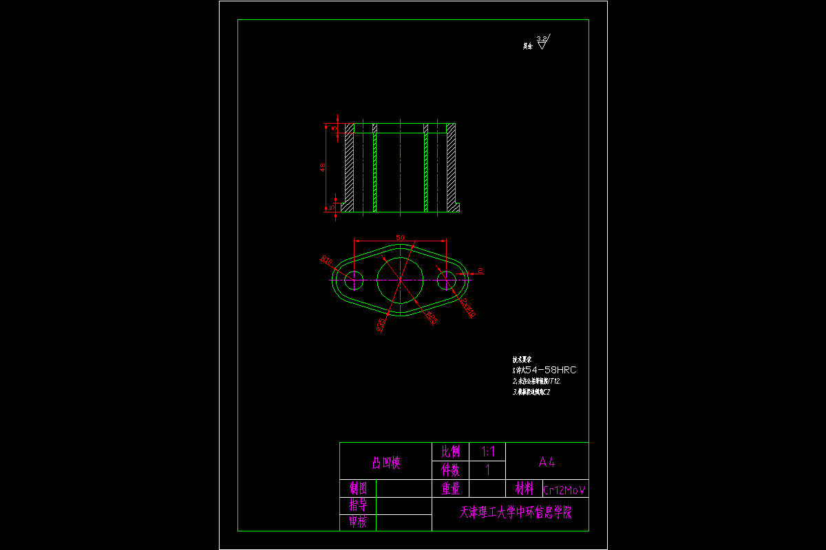 从工件结构分析,该工件轮廓结构由直线圆弧相切,工件形状具备对称性。模具的设计的设计先从工件的工艺结构出发,根据工件图只要求和形状来确定模具的设计方案,进步一确定模具制造精度等级,和排样设计从而确定出模具的类型结构,从实际生产的角度出发,为了节约模具制造成本,提高产品生产效率,保证工件的生产精度,该工件的冲裁模具设计方案采用了复合模具冲裁。在模具设计前主要查找工件图纸中未标注公差的尺寸公差,根据尺寸公差来确定模具制造的精度,经过多次的排样分析以后,开始进行模具的结构设计,计算模具的闭合高度、卸料力、冲裁力、、冲裁间隙、模具装配配合间隙、凸模高度、压力中心、模具总压力,根据总冲压力选择冲压设备;所有的设计方案确定以后开始绘制模具草图、装配图、零件图、编写技术要求、设计说明书。