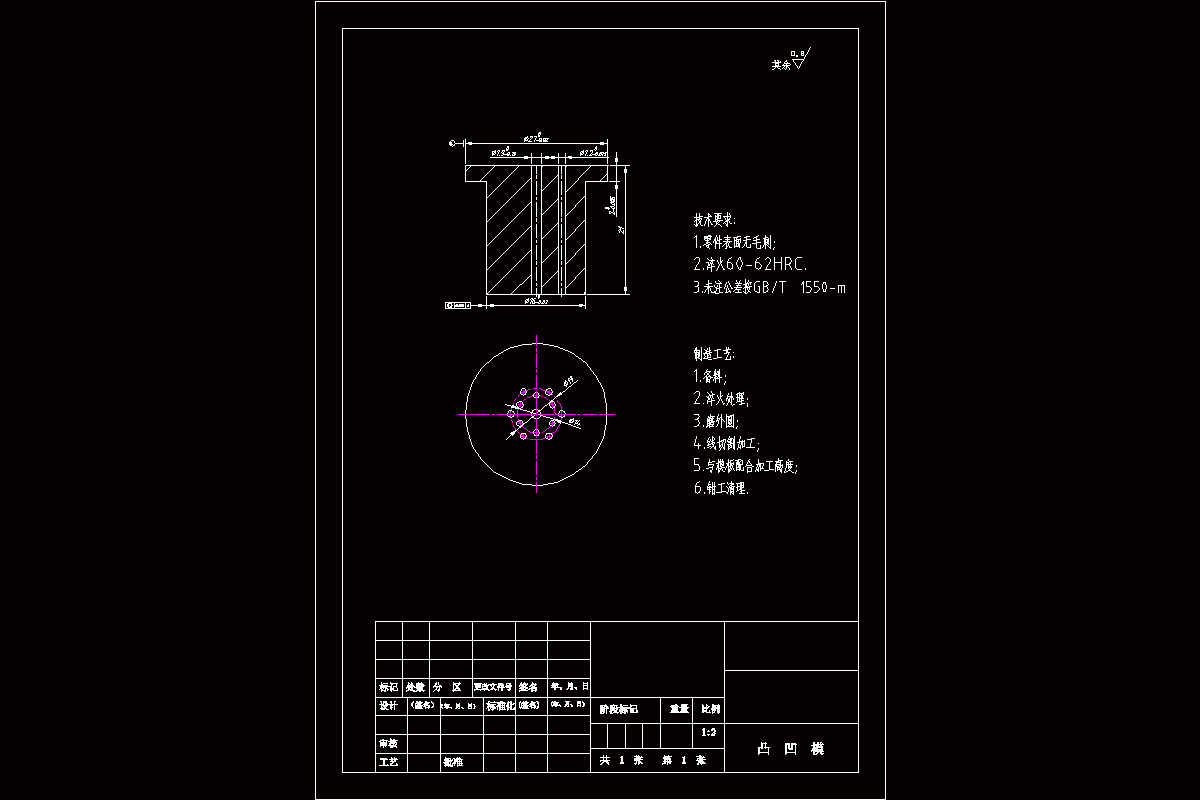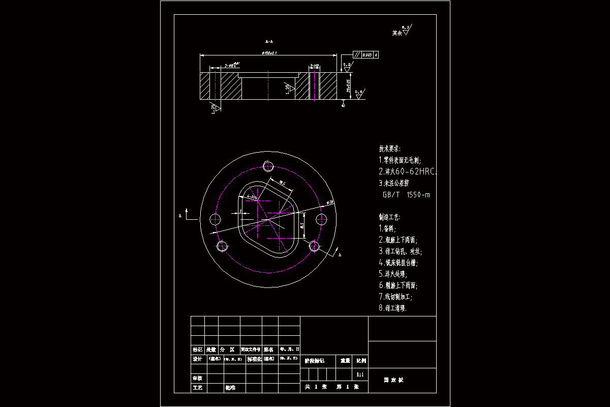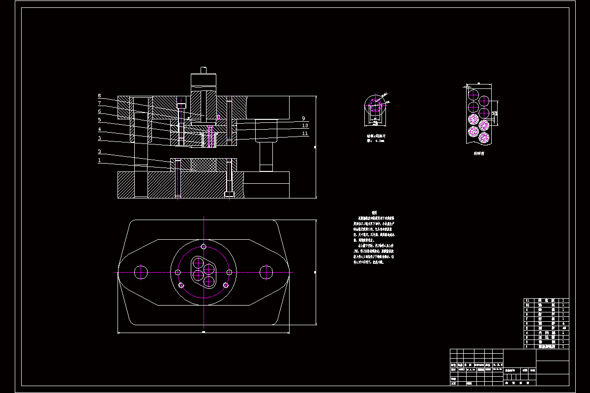 从工件垫片结构分析,该工件轮廓结构由直线圆弧相切,工件形状具备对称性。模具的设计的设计先从工件的工艺结构出发,根据工件图只要求和形状来确定模具的设计方案,进步一确定模具制造精度等级,和排样设计从而确定出模具的类型结构,从实际生产的角度出发,为了节约模具制造成本,提高产品生产效率,保证工件的生产精度,该工件的冲裁模具设计方案采用了复合模具冲裁。在模具设计前主要查找工件图纸中未标注公差的尺寸公差,根据尺寸公差来确定模具制造的精度,经过多次的排样分析以后,开始进行模具的结构设计,计算模具的闭合高度、卸料力、冲裁力、、冲裁间隙、模具装配配合间隙、凸模高度、压力中心、模具总压力,根据总冲压力选择冲压设备;所有的设计方案确定以后开始绘制模具草图、装配图、零件图、编写技术要求、设计说明书。