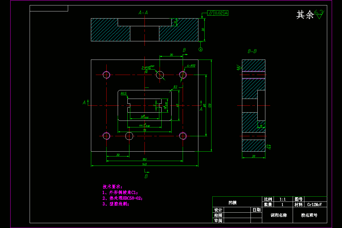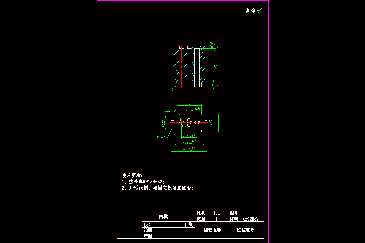 课程设计是在模具专业理论教学之后进行的实践性教学环节。是对所学知识的一次总检验,是走向工作岗位前的一次实战演习。其目的是,综合运用所学的理论和实践知识,设计一副完整的模具训练、培养和提高自己的工作能力。巩固和扩充模具专业所学内容,掌握模具设计与制造的方法、步骤和相关技术规范。熟练查阅相关技术资料。掌握模具设计与制造的基本技能,如制件工艺性分析、模具工艺方案论证、工艺计算、加工设备选定、制造工艺、收集和查阅设计资料,绘图及编写设计技术文件等。