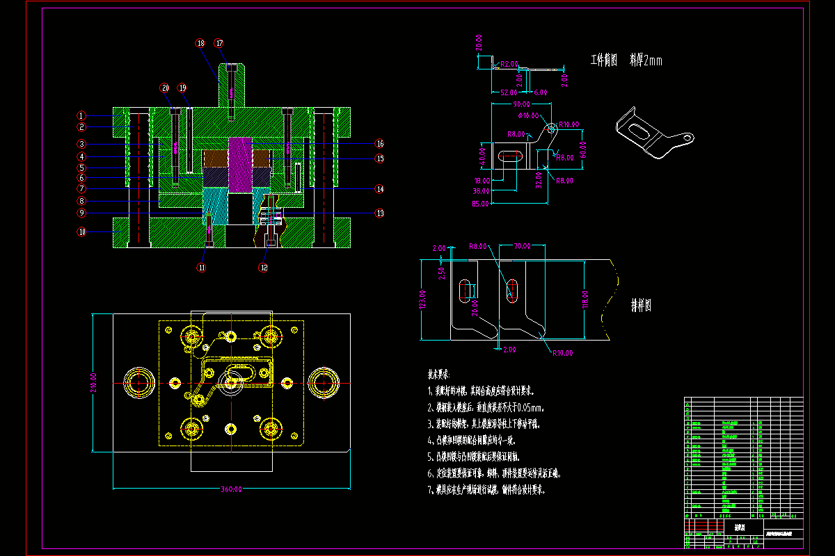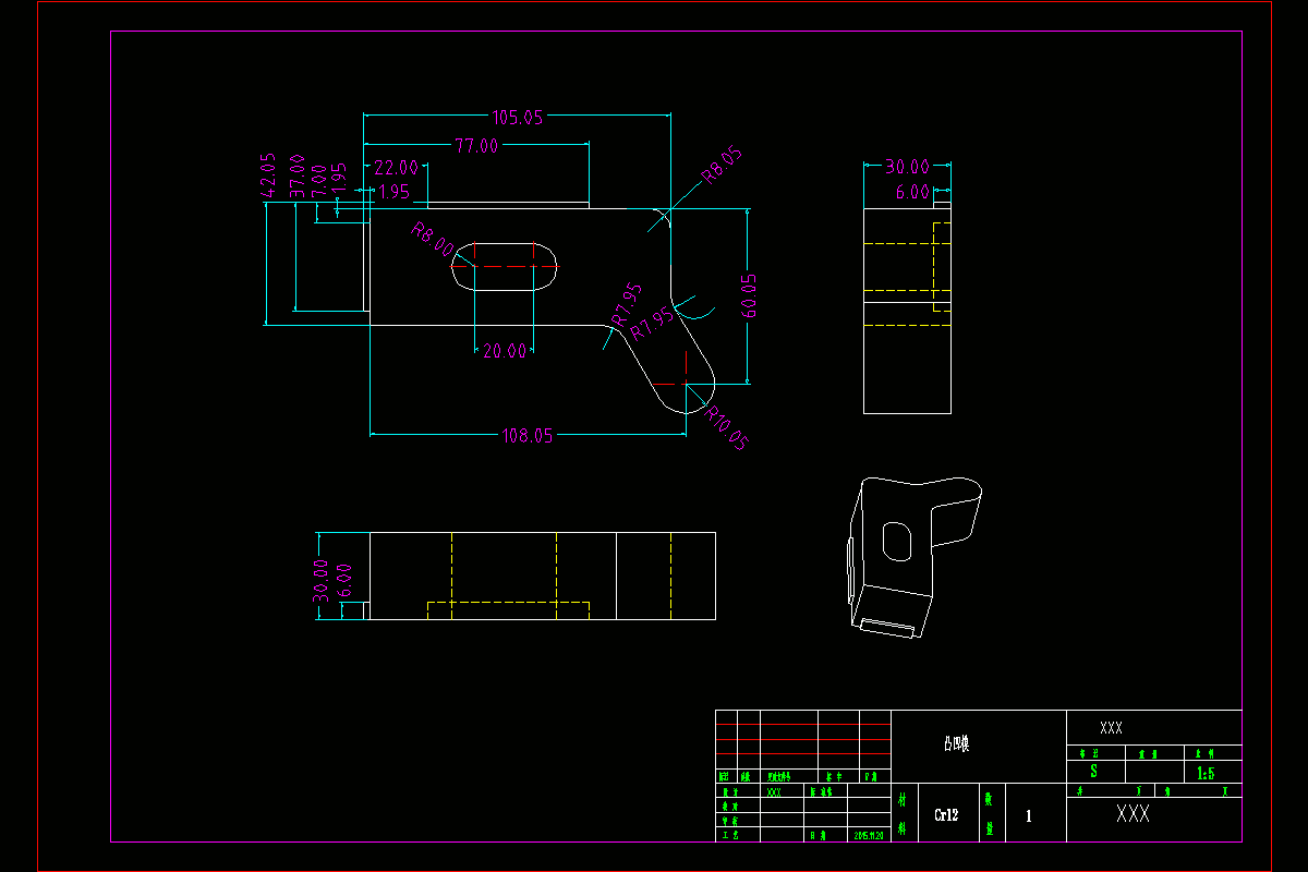 双长孔连接片的冲压件由冲孔、落料工艺构成,工件外轮廓为矩形,工件内轮廓为两个周长、体积相等的椭圆,所以工件具备轴对称和中心对称。因此模具的设计和排样从冲孔、落料、等工艺分析出发,工件工艺少,但工件尺寸较多,需要考虑各孔位冲裁时对其他孔的影响情况,查阅相关设计手册,工件是否符合冲裁加工。从实际生产的角度出发,为了节约模具设计、用材、制造成本,提高工件生产效率和尺寸精度,综合分析该工件的模具设计方案采用了复合模具冲裁。在模具设计前主要分析个尺寸轮廓工艺的受力情况,查找未标注公差的尺寸公差,根据尺寸公差来确定模具制造的精度,确定排样方案和条料的宽度,选取模架结构,计算模具的冲裁间隙、压力中心、模具闭合高度和冲压力的综合,再一步的选取相对应的冲压设备。