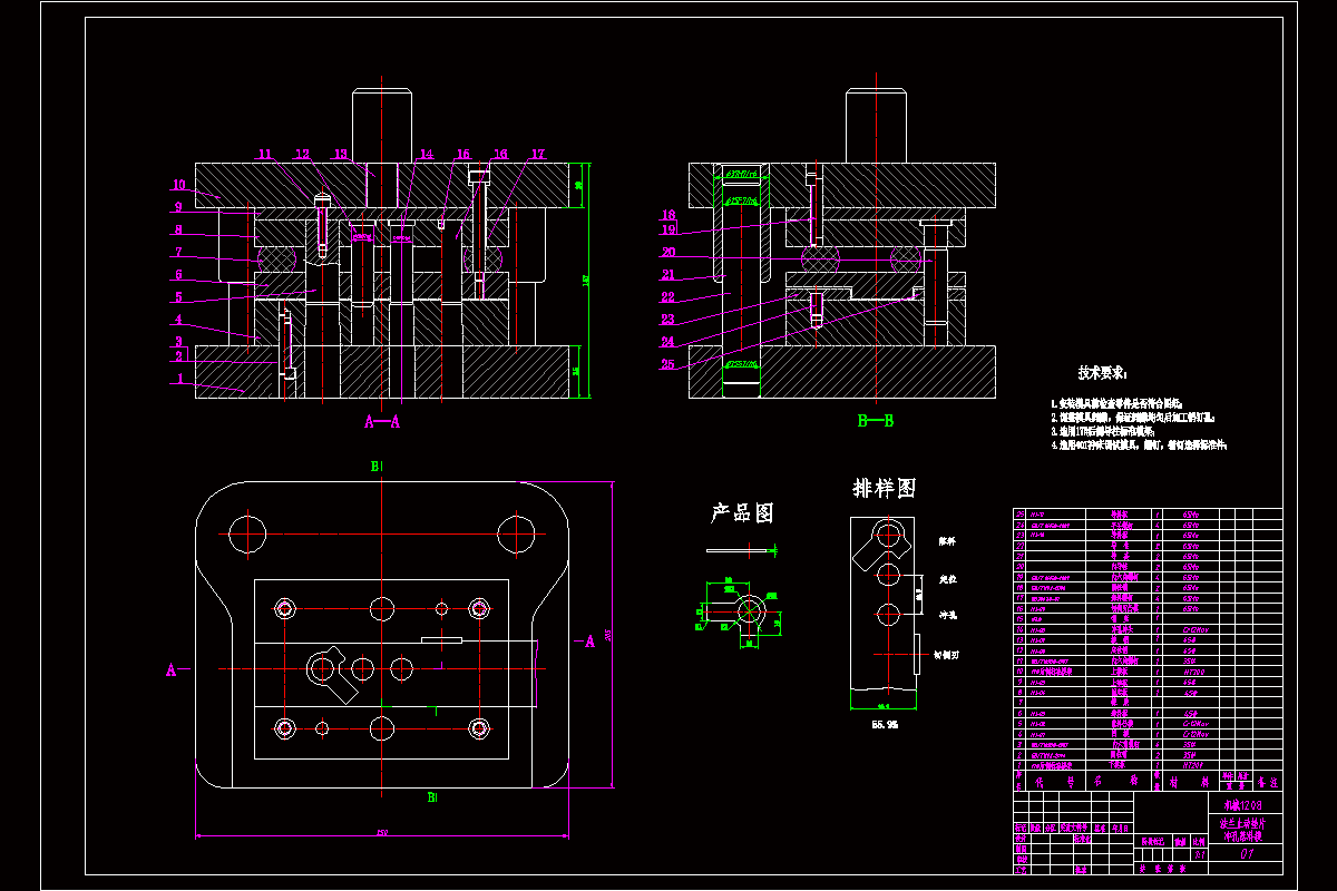 先分析零件的冲压工艺;确定模具的总体结构;结合零件的冲压工艺及模具的总体结构设计排样图;根据排样图,计算利用率、冲载力、压力、选用设备及刃口的尺寸。根据资料再用PRO/E,对模具进行设计。然后将三维图转成二维的装配图和零件图进行标注,并编制零件的加工工艺卡。