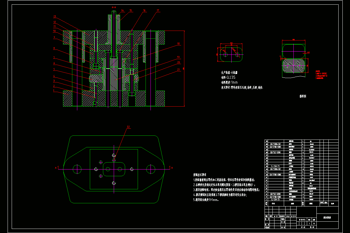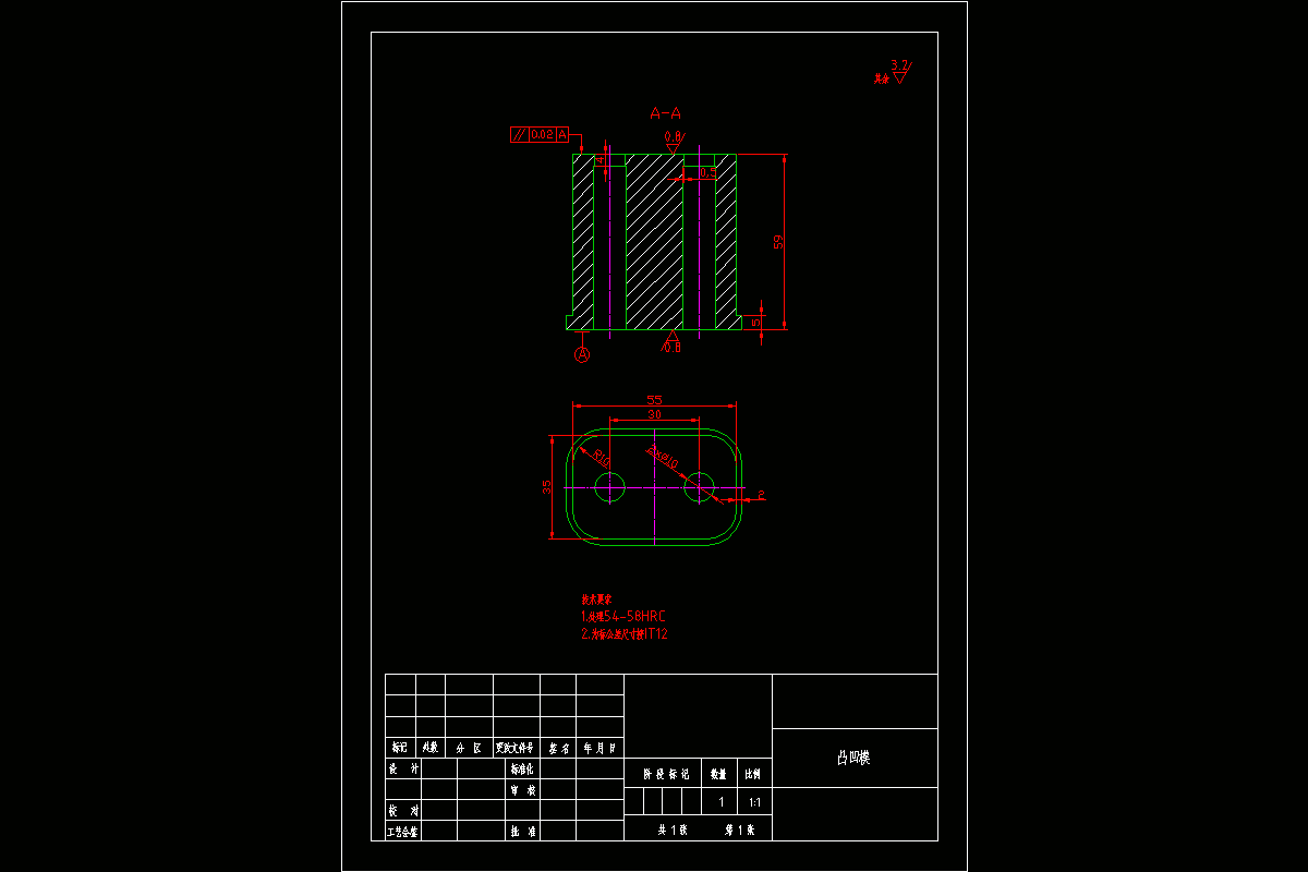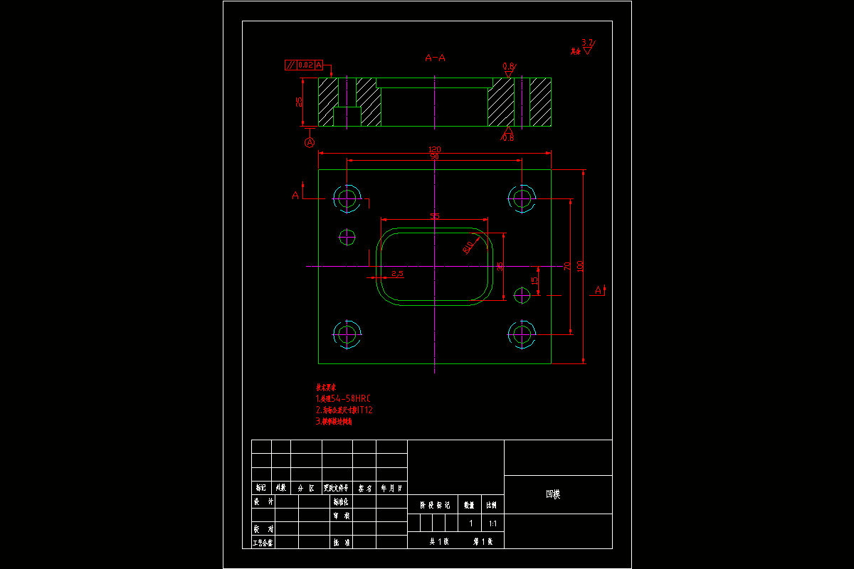 从工件结构分析,该工件轮廓结构由直线圆弧相切,工件形状具备对称性。模具的设计的设计先从工件的工艺结构出发,根据工件图只要求和形状来确定模具的设计方案,进步一确定模具制造精度等级,和排样设计从而确定出模具的类型结构,从实际生产的角度出发,为了节约模具制造成本,提高产品生产效率,保证工件的生产精度,该工件的冲裁模具设计方案采用了复合模具冲裁。在模具设计前主要查找工件图纸中未标注公差的尺寸公差,根据尺寸公差来确定模具制造的精度,经过多次的排样分析以后,开始进行模具的结构设计,计算模具的闭合高度、卸料力、冲裁力、、冲裁间隙、模具装配配合间隙、凸模高度、压力中心、模具总压力,根据总冲压力选择冲压设备;所有的设计方案确定以后开始绘制模具草图、装配图、零件图、编写技术要求、设计说明书。