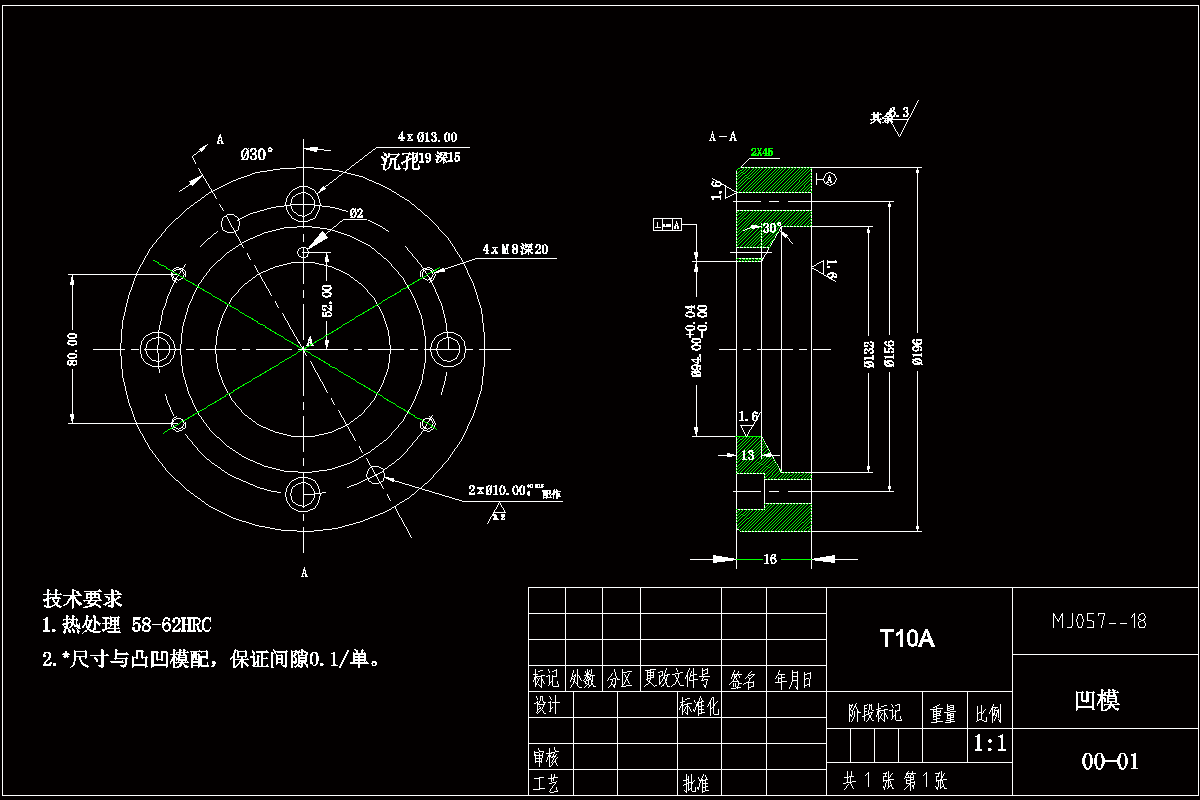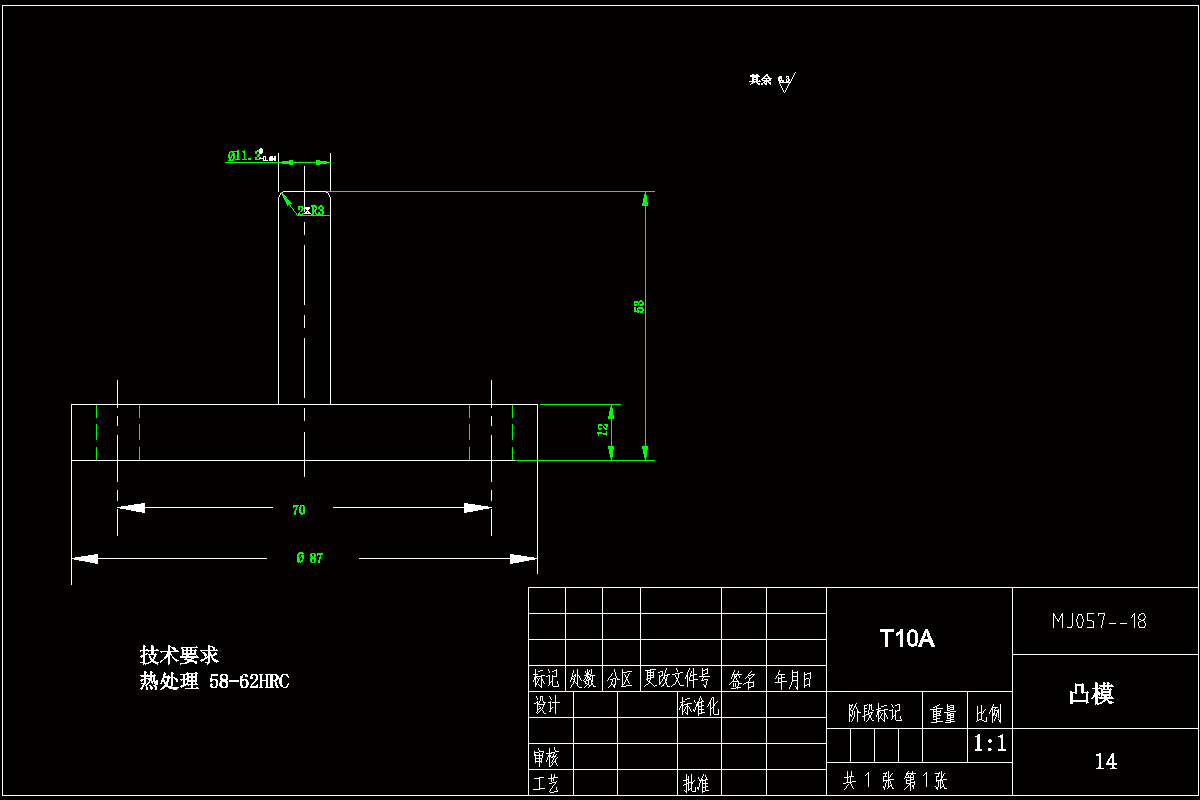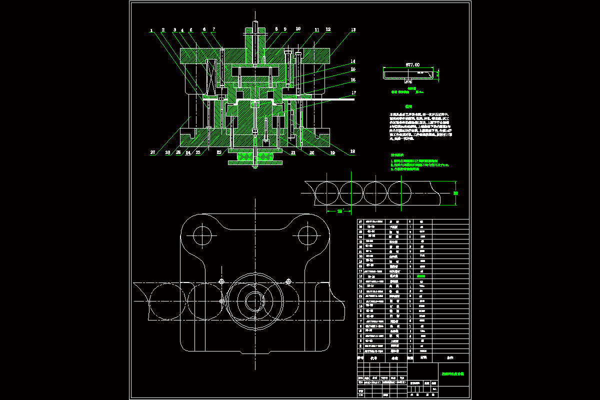 本模具的特点是推板在弹顶器,顶杆的作用下,处于最上位置,定位板固定坯料,上模部分下降,利用凸凹模和成形推板进行弯曲,上模继续下降,推动成形推板下降,此时由落料凹模,在成形推板内装有6根顶杆,开模时可使工件抬起,便于取件.