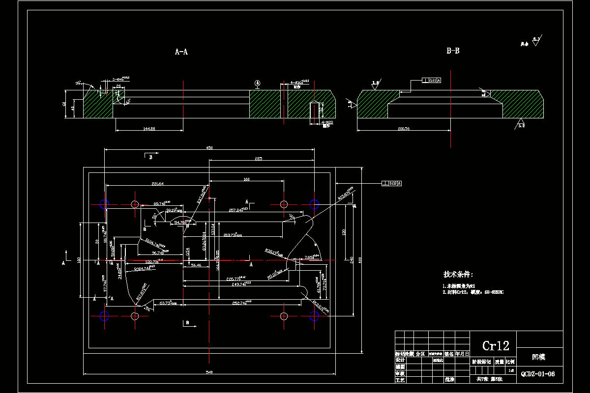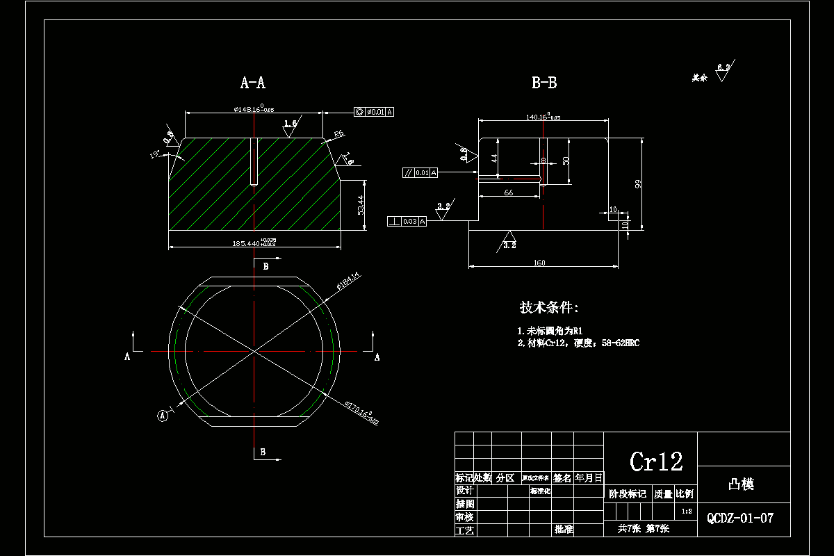 此零件结构复杂,需要多道工序完成,基本工序包括落料、拉深、冲孔、弯曲、翻边等。针对此产品件,应明确设计路线,确定设计方案,构思模具结构。首先对产品进行结构和尺寸分析,利用AUTOCAD绘出零件的三向视图,确定尺寸;之后确定优选的工艺方案(落料、拉深胀形、冲孔胀形、冲孔修边、冲孔弯曲冲孔、翻边);然后再进行必要的工艺计算和尺寸计算,利用AUTOCAD完成第一道工序落料拉深复合模装配图,并绘出各非标零件;然后同样用AUTOCAD完成第二道工序胀形冲孔复合模;对其它工序进行分析,确定每道工序的细节工作;最后完成设计。