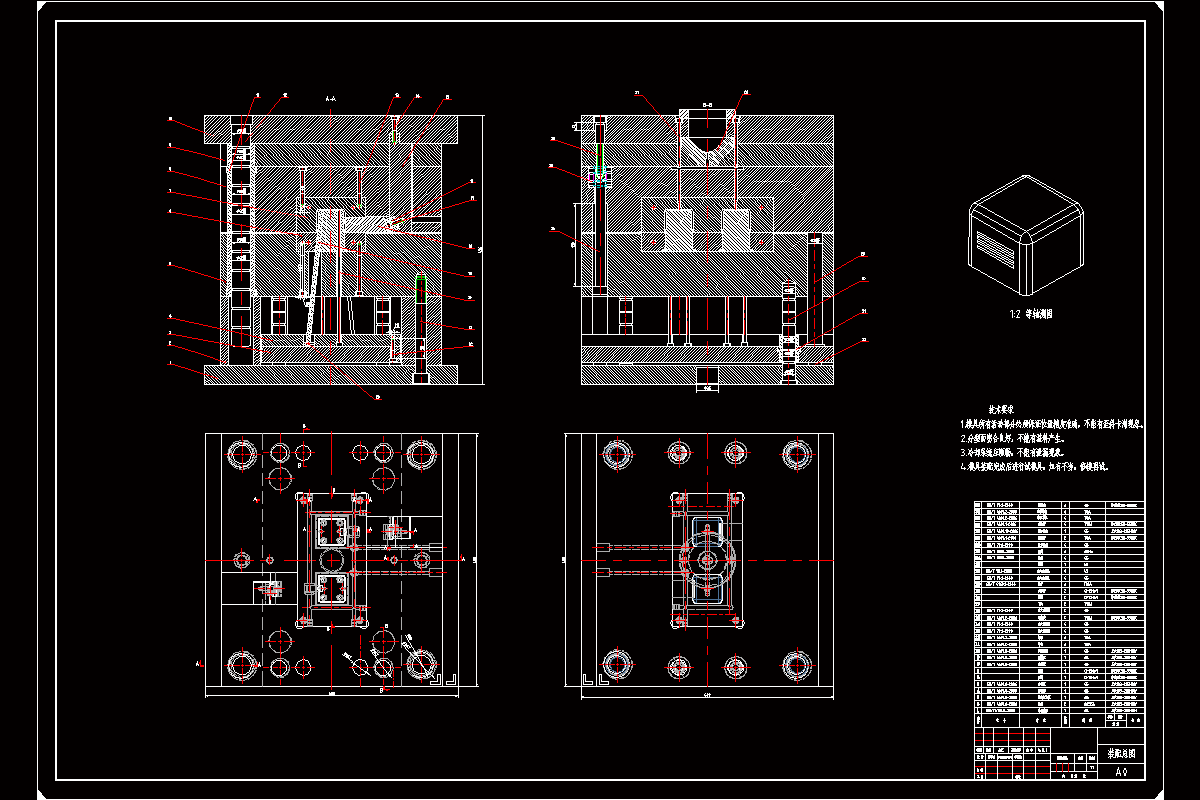 本次研究的对象是电器盒箱体模具注射成型过程。通过分析实物塑件,可以精确的绘制出它的二维和三维图。根据材料特性,塑件的几何特征确定了分型面。查阅相关专业书籍,设计出浇注系统,脱模机构和侧抽芯机构,并对成型零件中的定模型腔,动模型芯进行了设计,加热和冷却等进行了计算,最后对注塑机进行校核。通过研究,确定了本塑件的注塑过程采用ABS材料,一模两腔,点浇口以及滑块侧抽芯机构。 本设计采用solidworks, cad等软件,进行了塑料模具设计,为了更清晰地表达的模具的内部结构,有很多的模具结构和模具的局部图,通过其CAD二维图展示。
