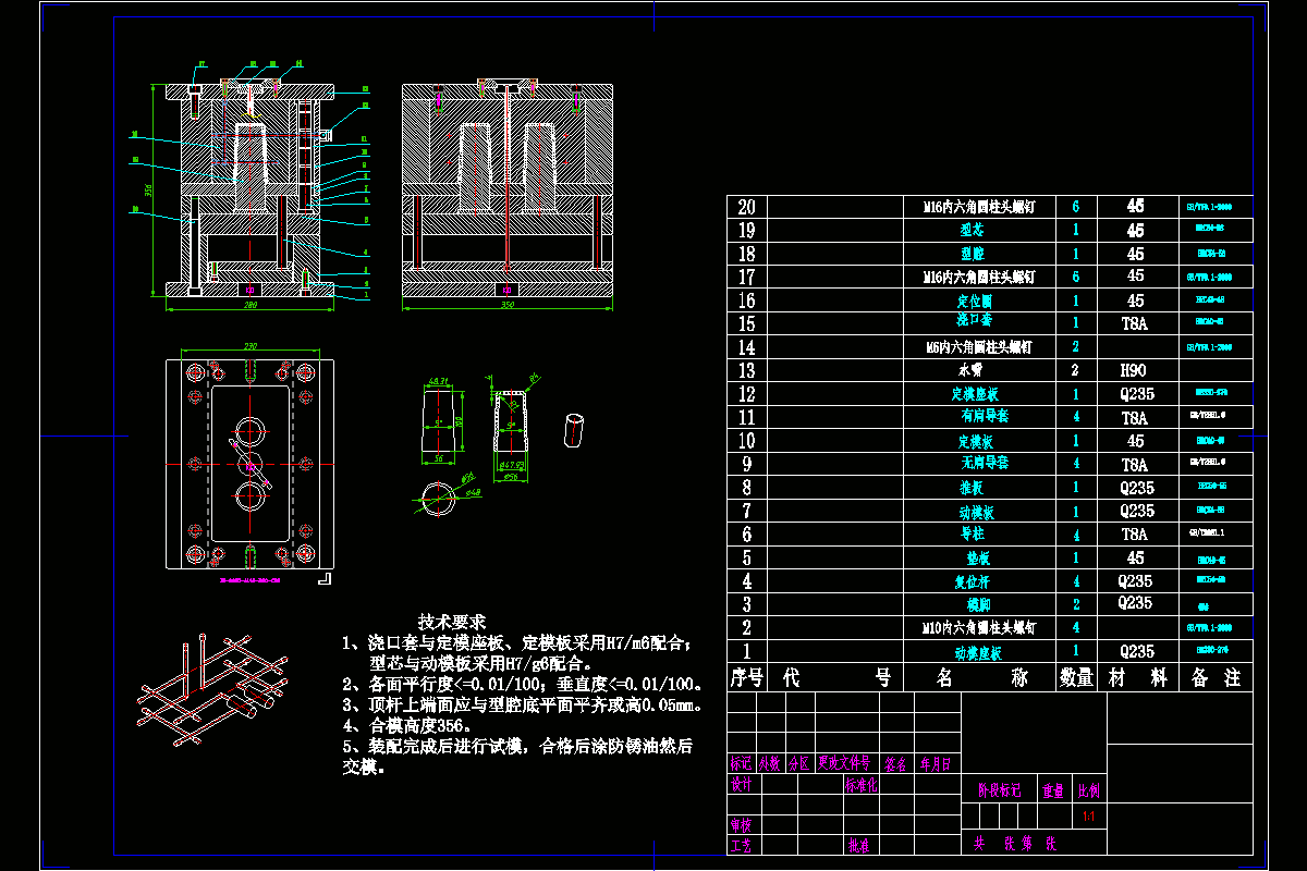 在正确分析塑件工艺特点和PP材料的性能后,对模具结构各工艺参数,包括锁模力、模具闭合高度等模具参数的进行了计算校核,设计了一副一模八腔、双分型面的侧浇口注射模具。利用AutoCAD或分析注射模的成型零部件,浇注系统,导向部件和脱模机构等。