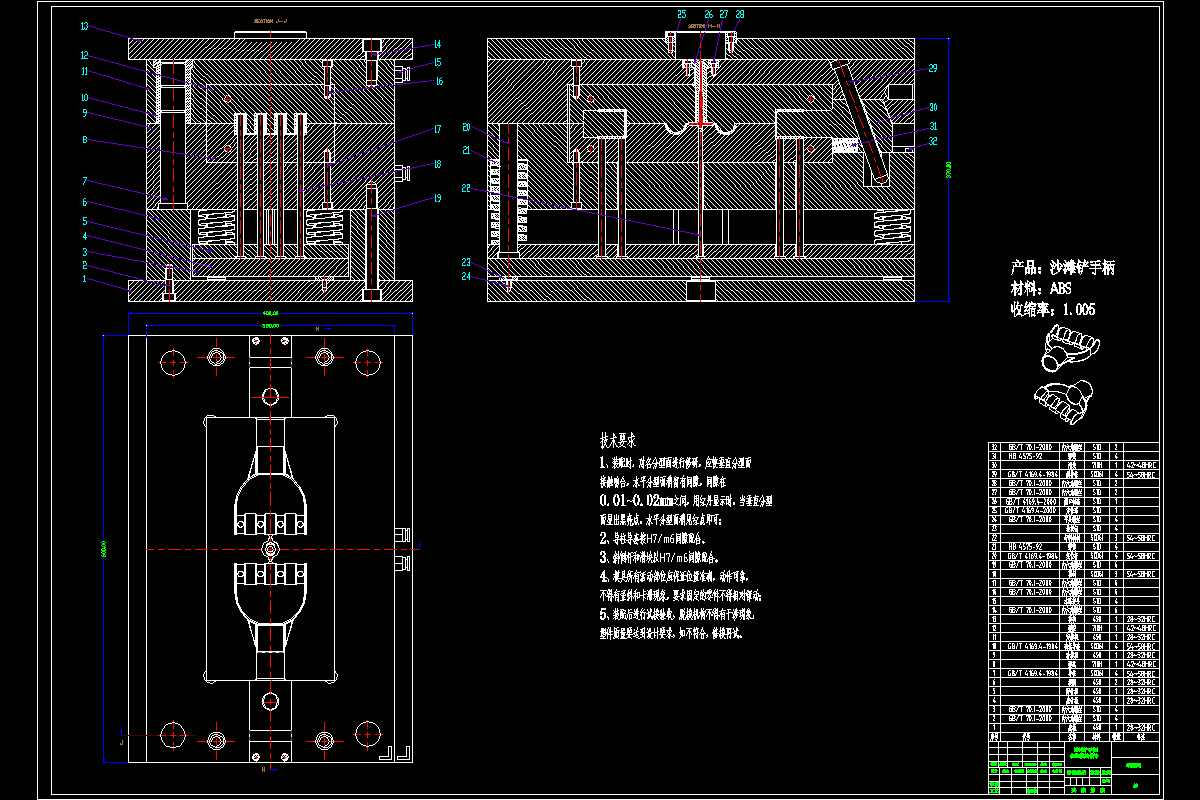 在本次的课题设计上,由于沙滩铲手柄外形的特殊性,为了方便设计和生产,选用了一模两腔的方案,出于表面外观要去的考虑,在进料的选择方式上用的是侧浇口把ABS材料浇注到模仁内。在注射机的选用方面,经过悉心挑选和向有关工厂技术人员的请教之后,这里选用了海天100 1A的注射机。在设计和合理性方面,还增加了冷却装置的设计。在本课题的主要表达方式上,使用CAD和UG软件绘制设计图。加上简介的语言表述,准确的数据计算,这些工作让手柄的设计更加合理化。在本课题上,主要介绍了手柄的选材,选用的模架类型,整个浇注系统设计,侧向抽芯的详尽描述,排气系统的设计等内容。由CAD和UG绘制图纸,使用合理的模具加工方式。由简明的示意图和计算等分析塑件,作为设计的参照。在上述的工作中,让我对于模具制造的认识和以前有了很大的不同。不仅仅是在专业知识上更加的熟悉了,还体会到了工厂工作人员的辛苦,还感受到了实际工作经验在真正的生产中的重要性。