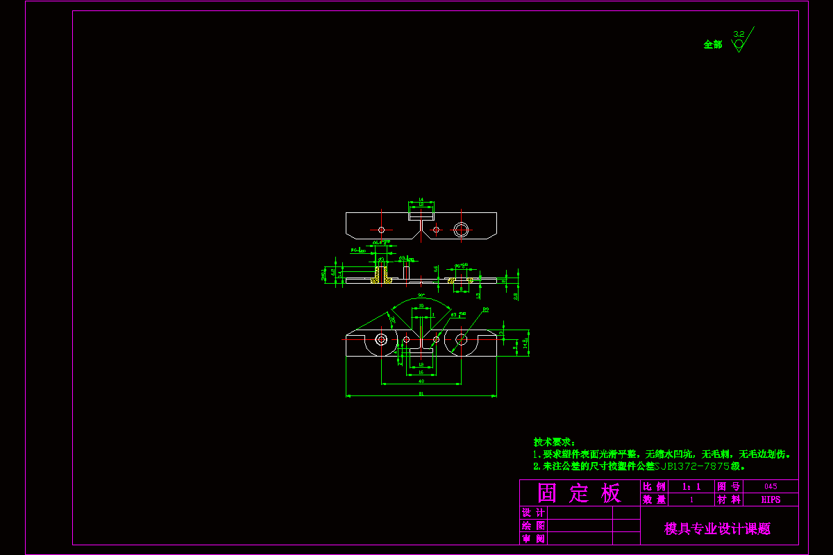 本次设计的题目是:一种固定板的注塑模具设计。指导老师给出固定板模型,通过建立此固定板的三维模型,用UG进行分析塑件的形状来确定所使用材料。大量查阅相关书籍资料获取背景知识,以及未来前景。计算其体积以确定注塑机型号等基本参数;随后设计型芯型腔等。因为此零件侧面有孔所以不能直接一次成型,须为其设计侧向抽芯机构;最后完成模架以及水路的设计。整套模具设计完成后进行调试校核。因为在做设计的时候正好在企业实习,在师傅的指导下完成了模具零件图,最后完成设计的编写。