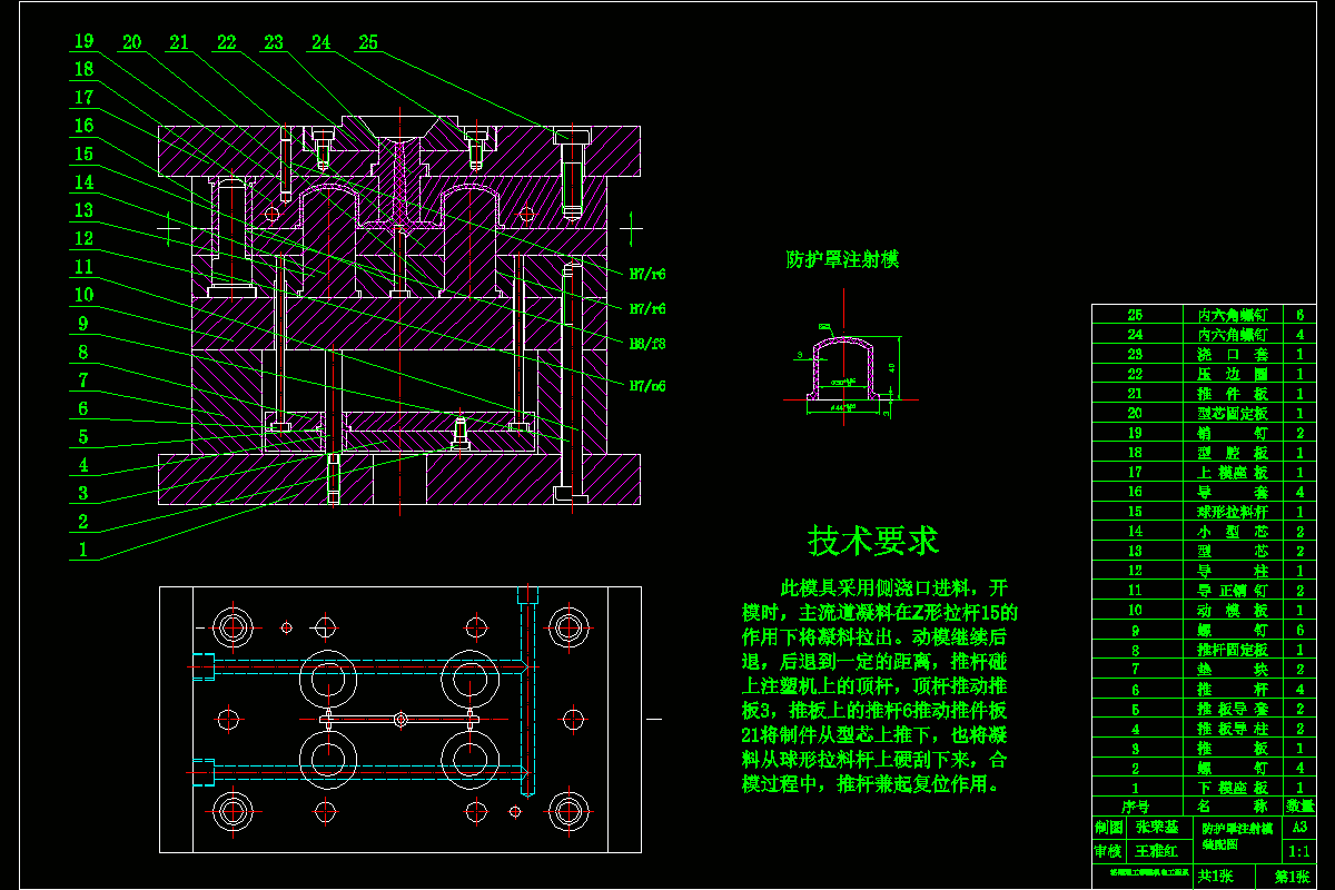 模具按制造的产品分类,可以分为塑料模具(又分为注塑模具、铸压模具和吹塑模具)、冲压模具、铸造模具、橡胶模具和玻璃模具等。其中,尤以注塑模具和冲压模具用途广、技术成熟、占据的比重大。本文以防尘塑料帽的模具设计为例,详细论述塑料的工艺特性、ABS塑料的工艺参数、型腔和型芯的结构形式、模具的机构设计、模架的选择原则,力求做到理论联系实际和反映国内外先进水平。