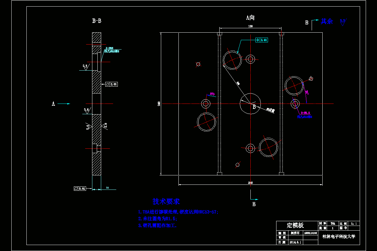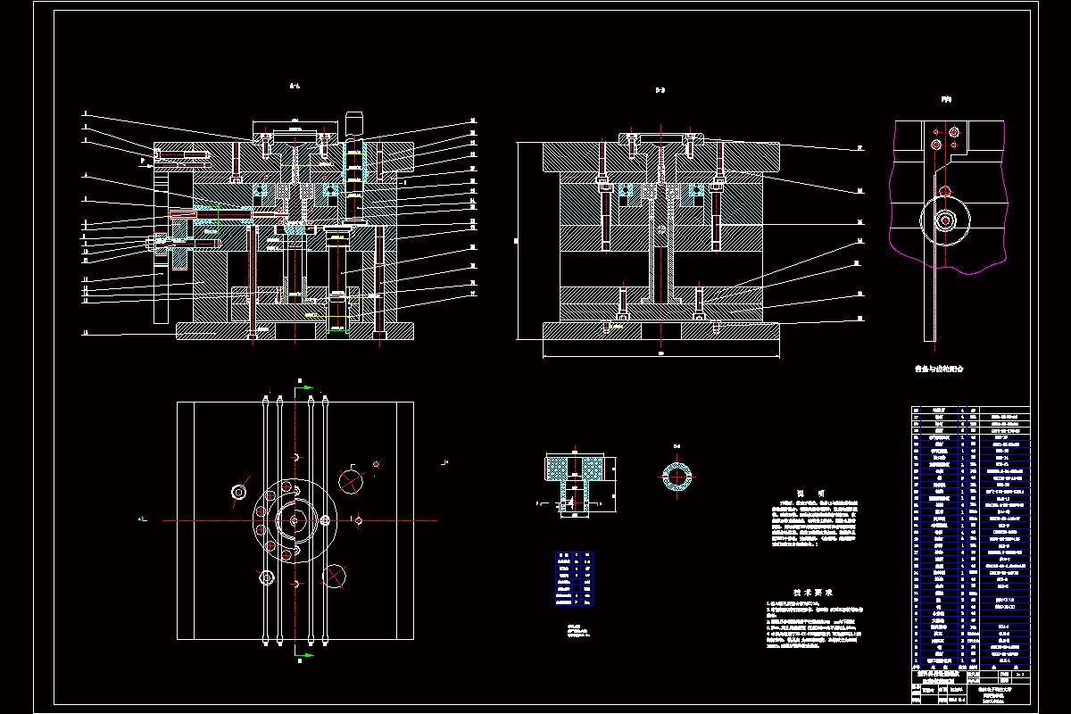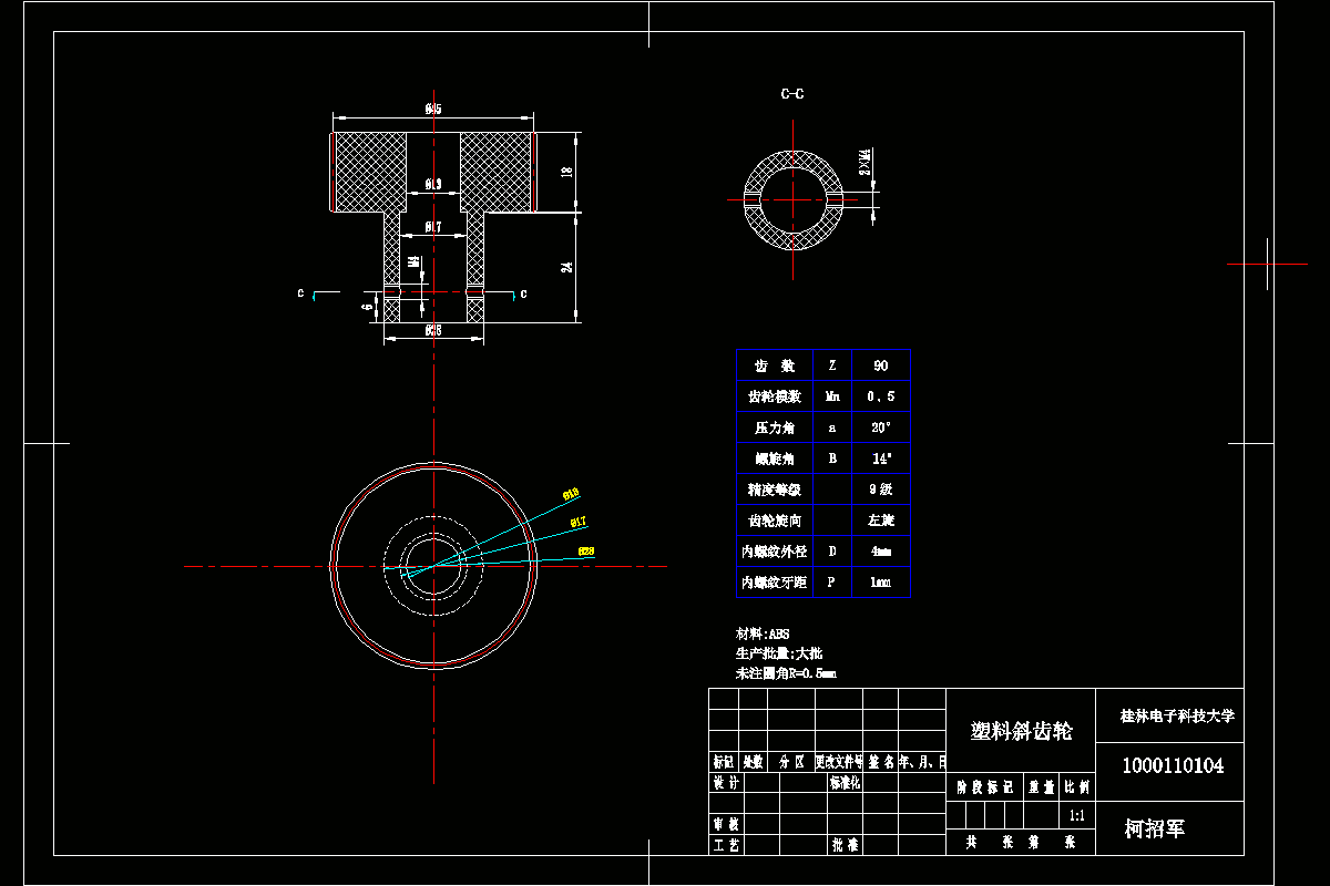 此次设计是对塑料斜齿轮注塑模具设计,难点在于实现自动旋转脱螺纹功能。本设计有两大亮点,一是使用齿轮齿条传动机构来实现测抽芯,二是用轴承使型腔旋转来实现脱螺纹设计。因模具中有多处需要配合,可能使模具在制造和装配方面有些难度。