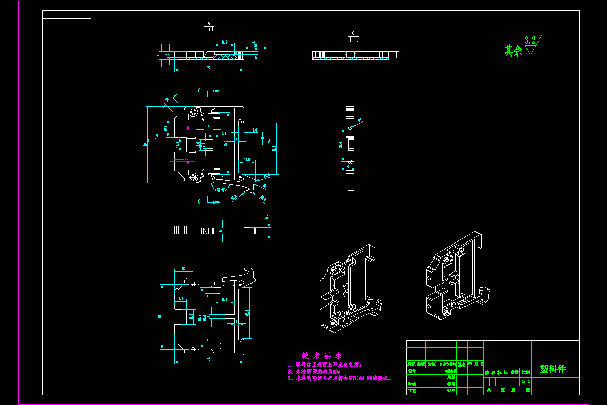 在本设计中,通过对对接线座,CAD模具设计和开发利用包括凸,凹模的设计,顶出机构的设计,注射机的选择和校核,浇注系统的设计,冷却系统的设计,模具及其他工作选择。在本设计中,重点设计了以成形件的凸,凹模的设计,浇注系统,冷却系统。浇注系统是模具设计的灵魂和冷却设计,浇注系统的设计直接影响着塑件的成型质量和生产效率。因此,浇注系统的设计是注射模具设计工作的关键。同时,模具温度对塑件的质量和生产效率有着直接的影响,对模具的凝固时间和收缩应力,模具温度的控制直接影响,从而影响模具和塑料件质量的成型周期,和表面粗糙度。大小的凸,凹模尺寸,浇注系统和冷却系统的设计重点和系统结构设计。通过这样的设计,我们首先学习了解当前的形势和发展情况,中国塑料模具结构和成型工艺的模具及注射模具设计的基本原理。