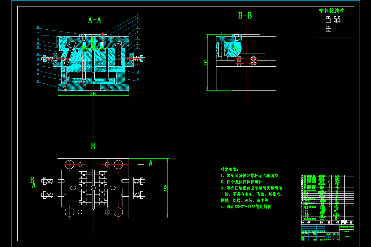 本次设计的是塑料接线柱塑料模具,体现了典型塑料模的设计要求、内容及方向,有一定的设计意义。通过对该模具的设计,加强了设计者对塑料模设计基础知识的理解和运用,为设计更复杂的塑料模具做好了铺垫。