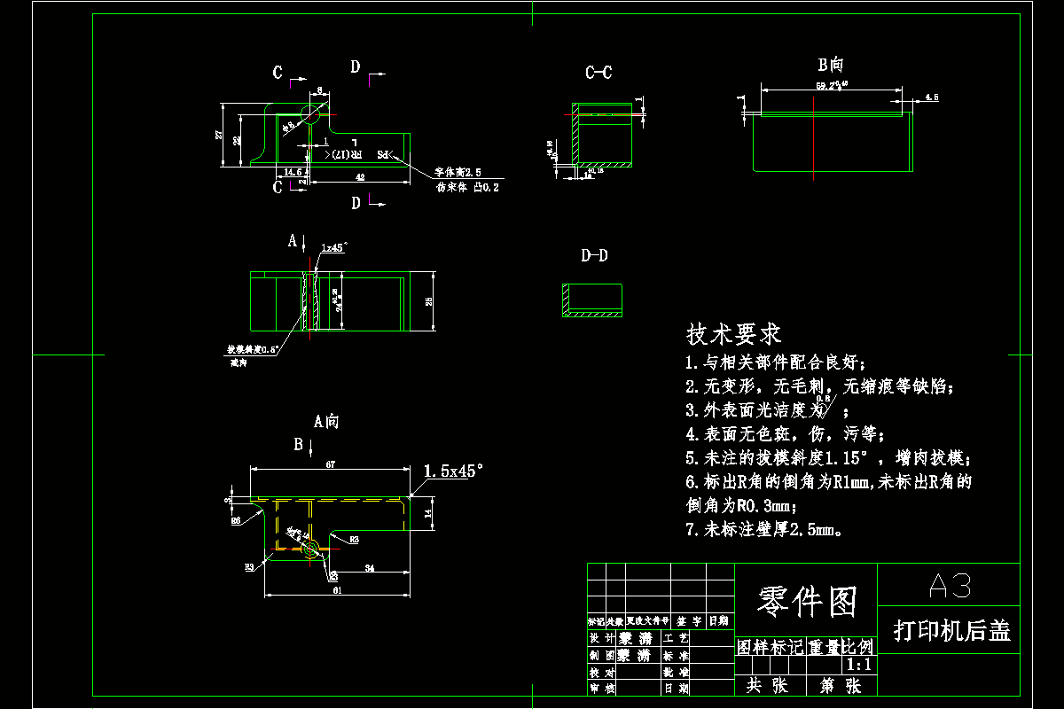 本设计主要介绍了打印机外壳注射成型的基本原理和过程。首先通过对打印外壳的分析确定材料和基本尺寸及精度。根据上述分析结果确定模具的基本的方案、具体结构和相关尺寸:为了保证塑件外表面的质量应尽量避免因分型面而出现的疤痕,该分型面为塑件断面尺寸最大的部位,便于塑件的脱模;型腔的数目为一模两腔,为了加工方便采用镶拼式型腔;本次设计的浇口为潜伏式浇口;对型芯、型腔、导向机构及脱模机构进行了详细的设计计算;选择了注射机型号并对其相关参数进行验证,包括锁模力和安装尺寸等。最后绘制了模具的装配图及模具的主要零件图并撰写了说明书。