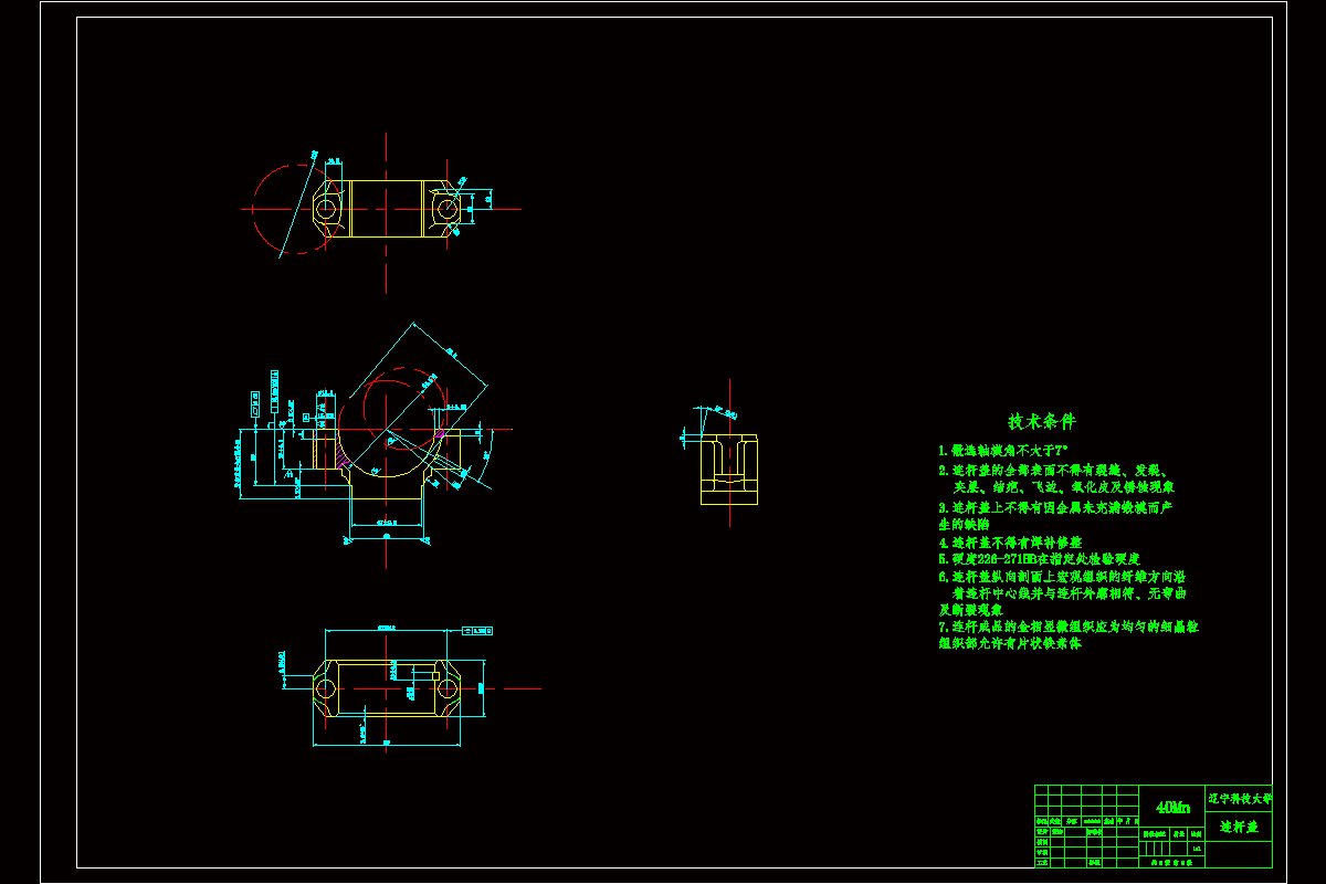 我的设计题目是汽车连杆机械加工工艺规程及其精镗大端孔和小端孔夹具设计,汽车连杆材料为40Mn,壁厚、应力分布均匀。设计分为两部分:汽车连杆工艺和精镗大端孔和小端孔夹具。