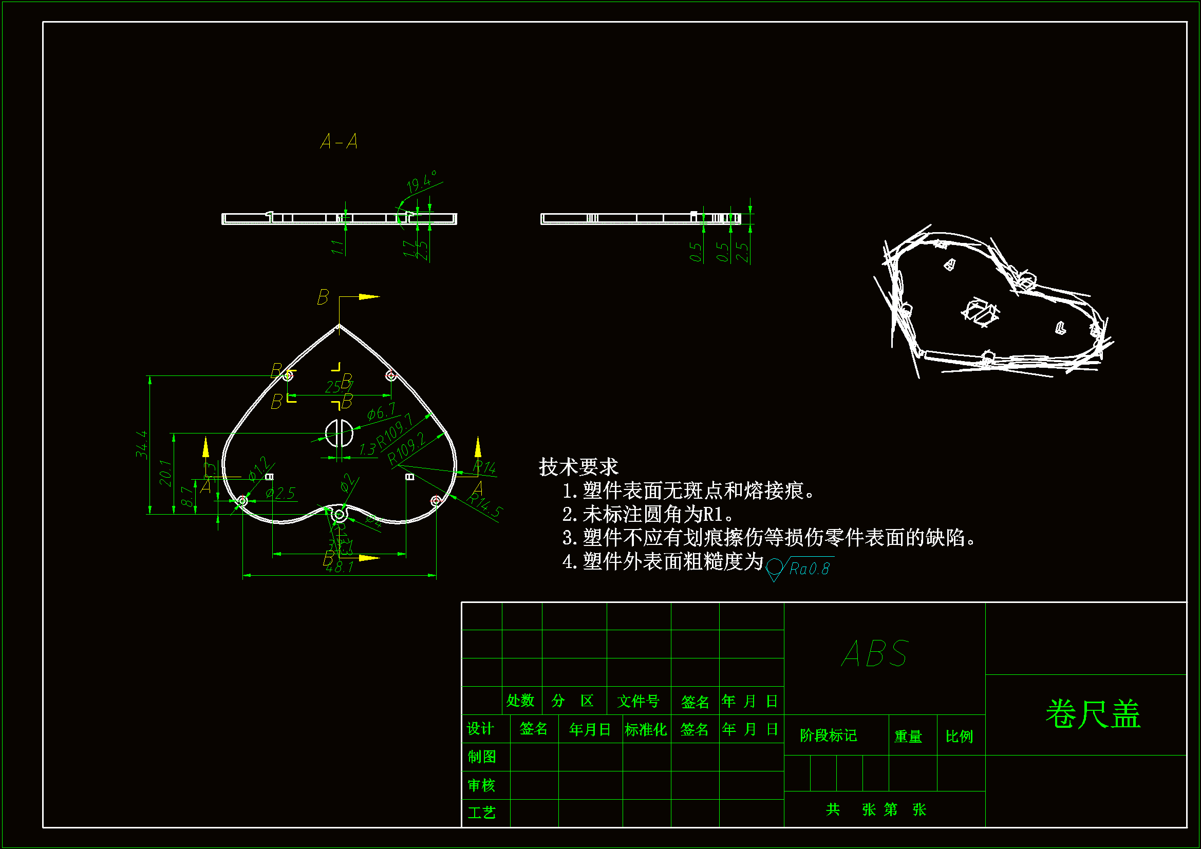 在本次研究的是卷尺盖的注塑成型。首先分析产品的成型工艺,然后根据产品结构,设计如何分型,及型腔数目,进胶方式。在此要全面考虑零件的加工方法,特别要简单方便和精准,同时要对相关尺寸的进行计算和校核,再设计浇注系统,冷却系统,排气系统,脱模机构,导向机构,以及模架的选择。采用CAD,UG 等软件来辅助分析设计是否合理,选择合理的工艺参数和设计方案。