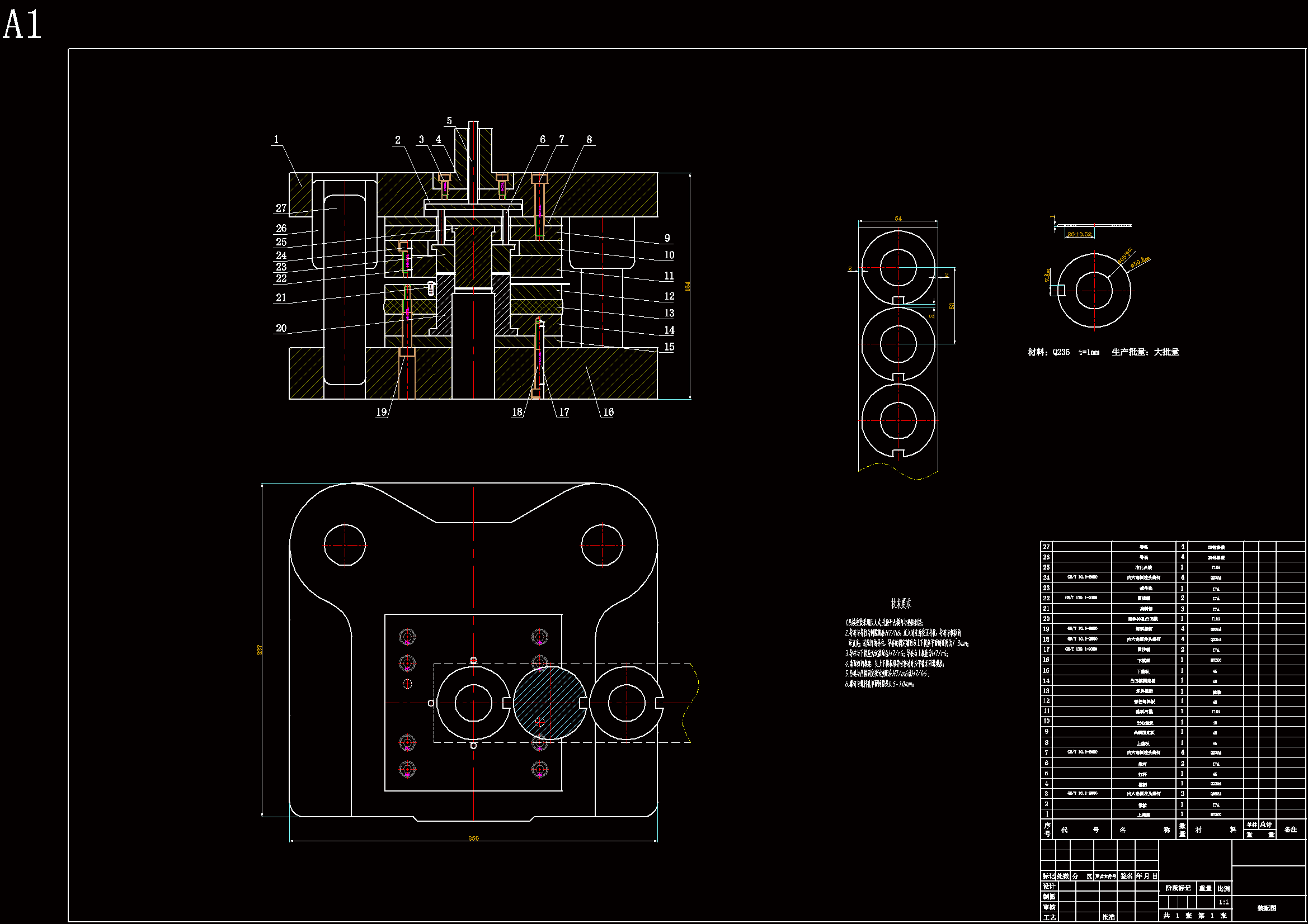 零件结构形状相对简单,无尖角,对冲裁加工较为有利。零件中有1个圆形孔,孔的直径为25mm,孔离工件边缘的距离最小为7.5mm。根据该零件形状来分析,该零件的结构满足冲裁要求。