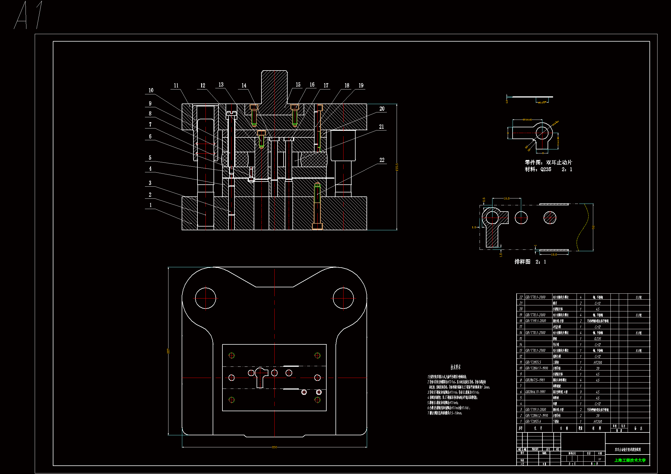 本课题设计了一款双耳止动的冲压模具,通过冲裁件工艺性分析即材料分析和结构形状分析确定了冲压模具设计方案,是包含落料和冲孔两个工序的级进合模。设计过程中分别对送料方式、定位方式、卸料方式、导向方式做了详细的阐述。另外,对排样方式、冲压力做了详细的分析和计算,最终确定了冲压设备的型号。 在冲压模具结构设计方面,送料采用自动送料机构,能够实现工件的自动化生产,提高了生产效率的同时节约了人工成本;制件厚度小、重量轻,所需卸料力比较小,因此采用弹性卸料板作为卸料方式,弹压卸料板具有卸料和压料的双重作用,主要用于料厚较薄的板料,由于有压料作用,冲件比较平整;由于工件尺寸小,精度要求高,采用后侧导柱模架作为导向方式,不但能省料,而且导向精度也比较高。
