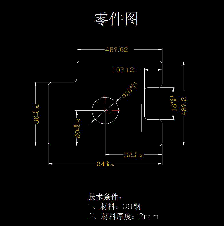 零件结构形状相对简单,无尖角,对冲裁加工较为有利。零件中有1个圆形孔,孔的直径为15mm,孔离工件边缘的距离最小为12.5mm。根据该零件形状来分析,该零件的结构满足冲裁要求。