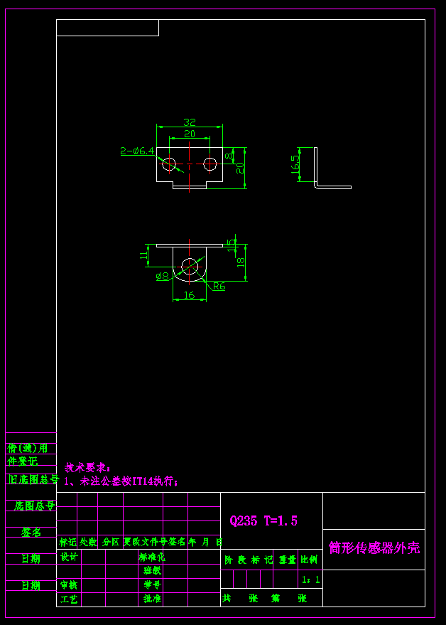 冲压工艺与模具设计应结合工厂的设备、人员等实际情况,从零件的质量、生产效率、生产成本、劳动强度、环境的保护以及生产的安全性各个方面综合考虑,选择技术先进、经济合理、使用安全可靠的工艺方案和模具,以使冲压件的生产在保证达到设计图样上的各项技术要求,尽可能降低冲压的工艺成本和保证安全生产。 关键词: 工艺性分析、模具工艺方案论证、工艺计算、加工设备选定、制造工艺、收集和查阅设计资料,绘图及编写设计技术文件等。