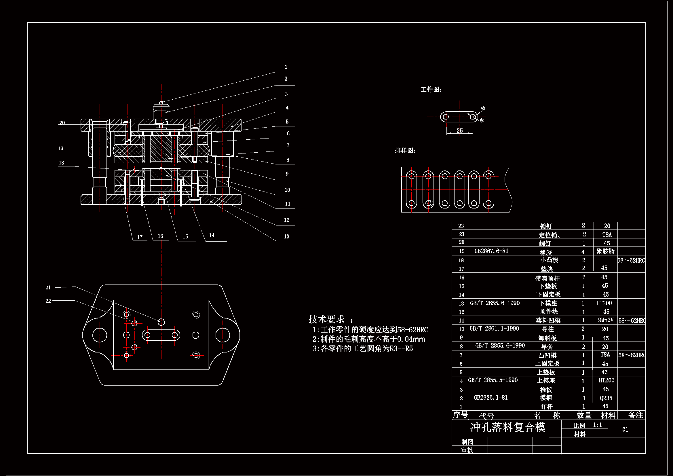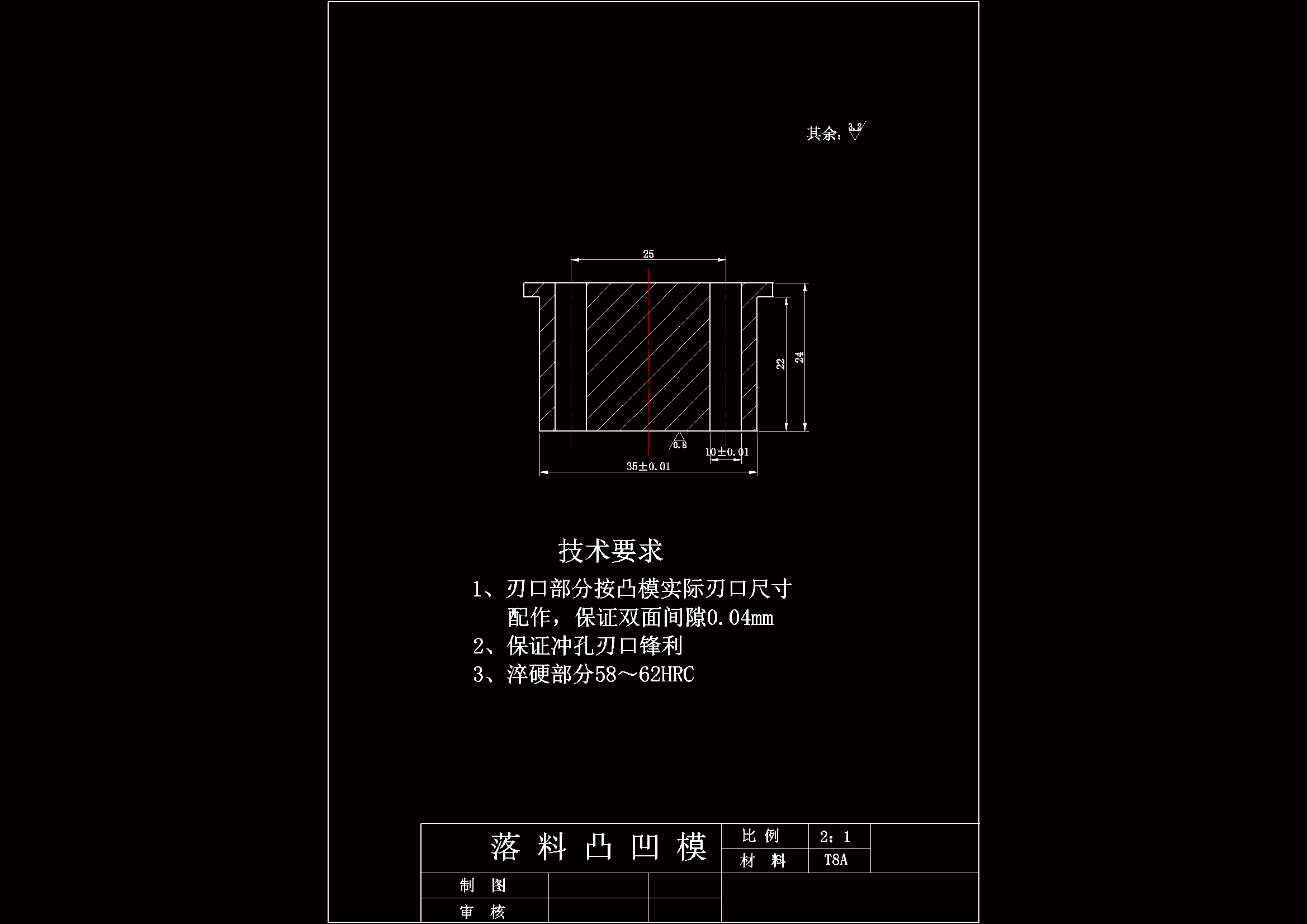设计着重介绍了制件的成型工艺,及模具结构设计。通过对制件的工艺分析,确定了工艺方案。并设计了一套正装复合模具。在设计同时利用参考资料,确定了各工作零件的尺寸。并较多的考虑了模具结构的调整性、易更换性及模具成本。同时在模具设计内容中融汇了冲压模具的不同加工方法、加工工艺及装配工艺,对初学冲压模具模设计者有一定的参考价值。本设计从模具设计到零部件的加工工艺以及装配工艺等进行详细的阐述,并应用CAD进行各重要零件的设计。