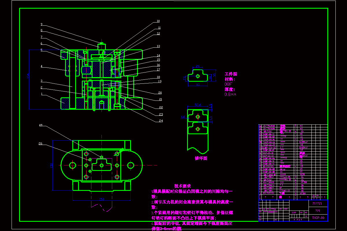 冷冲冲裁模主要用于金属制品的成型,它是冲压制品生产中十分重要的工艺装置。冲压模的基本组成是:上下模座、下模垫板、下模固定板、凹模镶块、抬料钉、导料板、卸料板,导柱导套、卸料板弹钉、卸料板等。